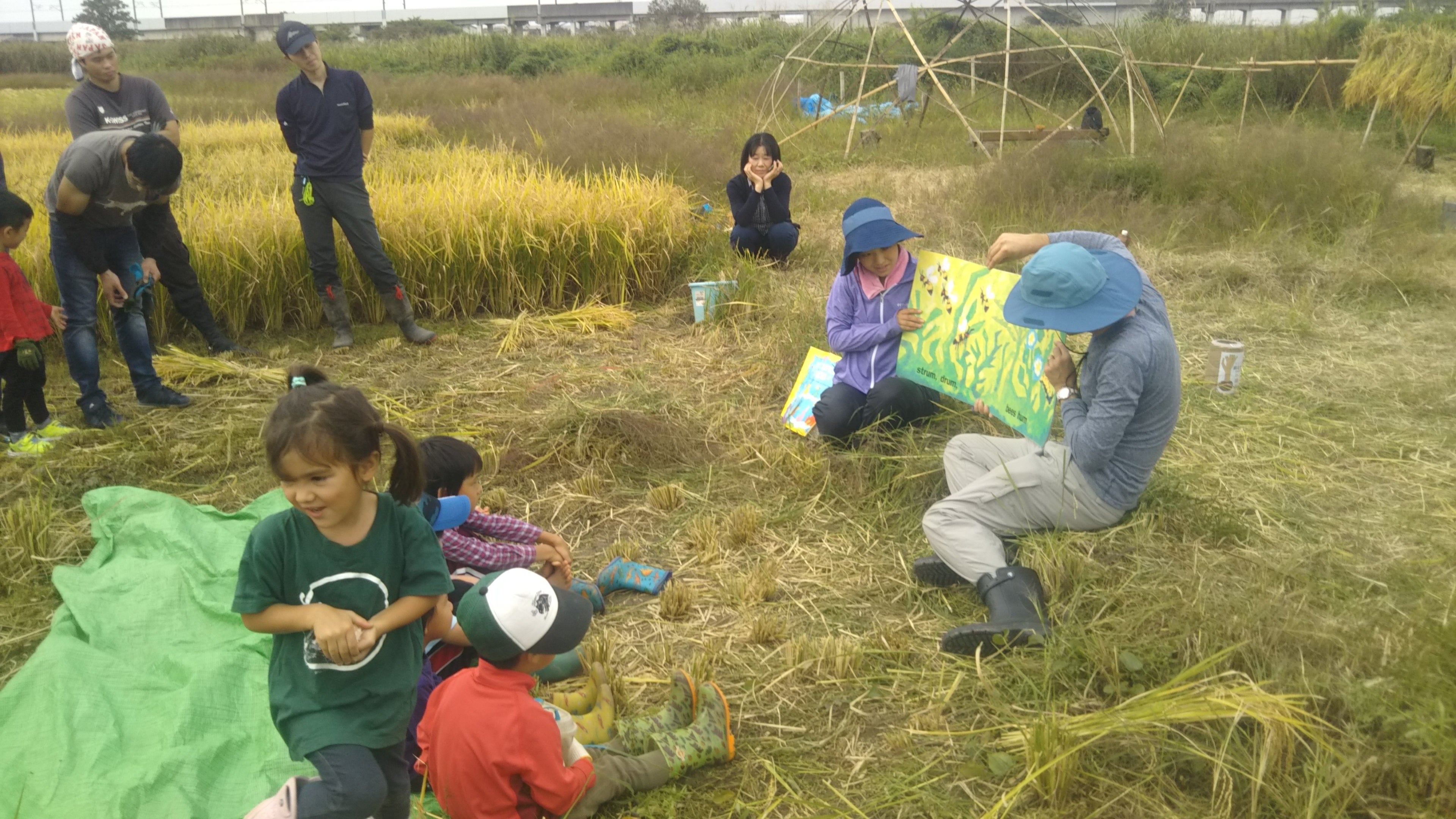 ムクロジ田んぼ、10月にはいって、いよいよ 待ちに待った稲刈りです。素人とは思えない、と、昨年、研修農園で米作りを教えてくれた百姓先生に褒めていただきました。森のようちえんのみんなの愛情のなせる技かも知れないですね。やっていくうちに、子どもたちは道具の使い方にも慣れていきます。子どもたちは、自分たちの手足を思うように動かすための試行錯誤を覚えています。慣れない道具は、思い通りに動かない「手」の延長です。試行錯誤を繰り返しながら、しっくりくる道具の使い方を自分で学びます。そこには新しい発見があり、子どもたちはまた一つ身体に沁みつく知恵を身につけるのです。森の中にも、田んぼの中にも、畑の中にも、子どもたちを育てる先生が隠れています。私たちは、子どもたちに何かを教えるのではなく、魔法のような子育てを知っている先生と、子どもたちを引き合わせる、お手伝いをしているだけです。