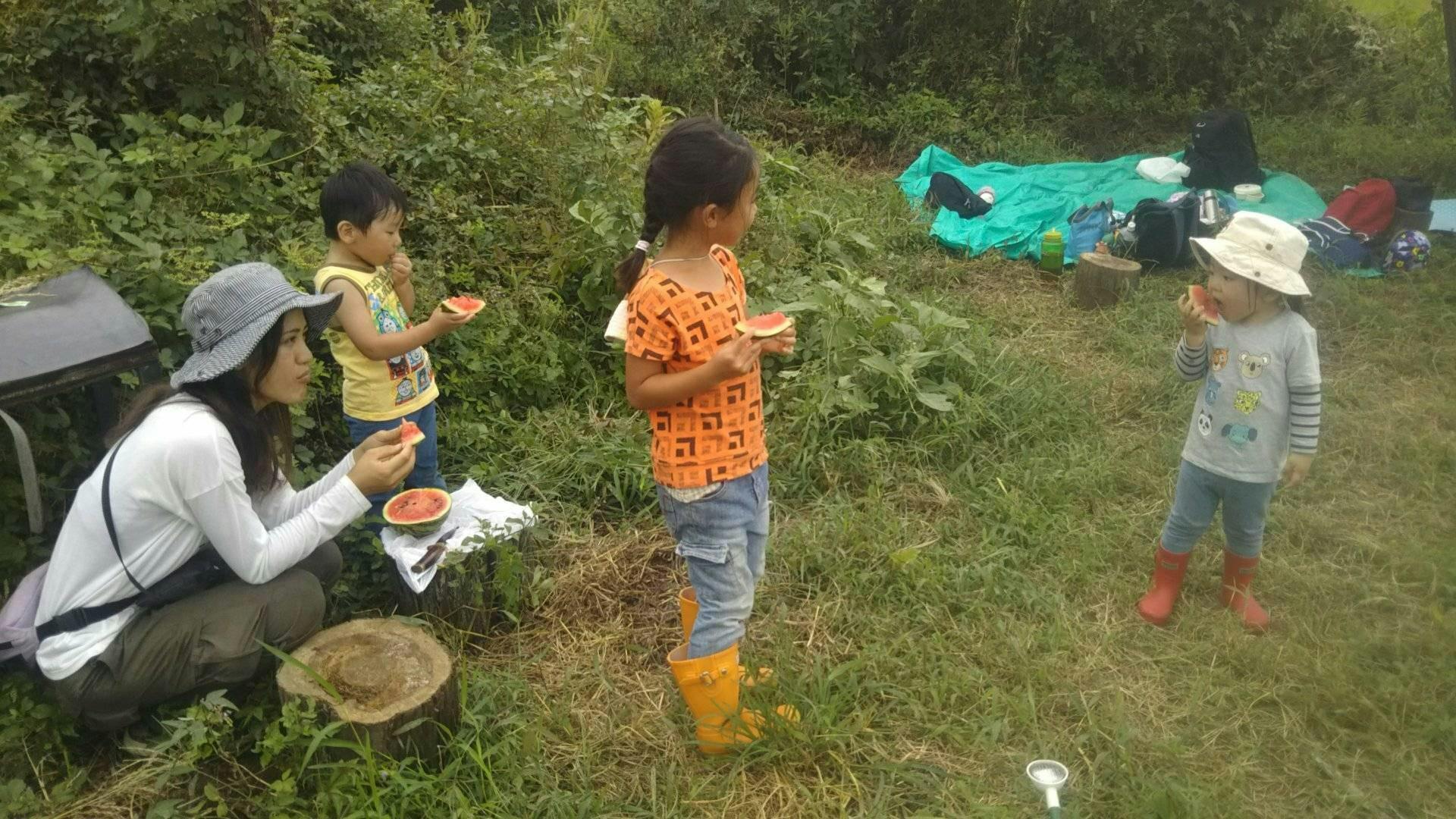 子どもたちは、自分たちで植えて、勝手に育ったスイカを頬張り大地の恵みを体感します。
