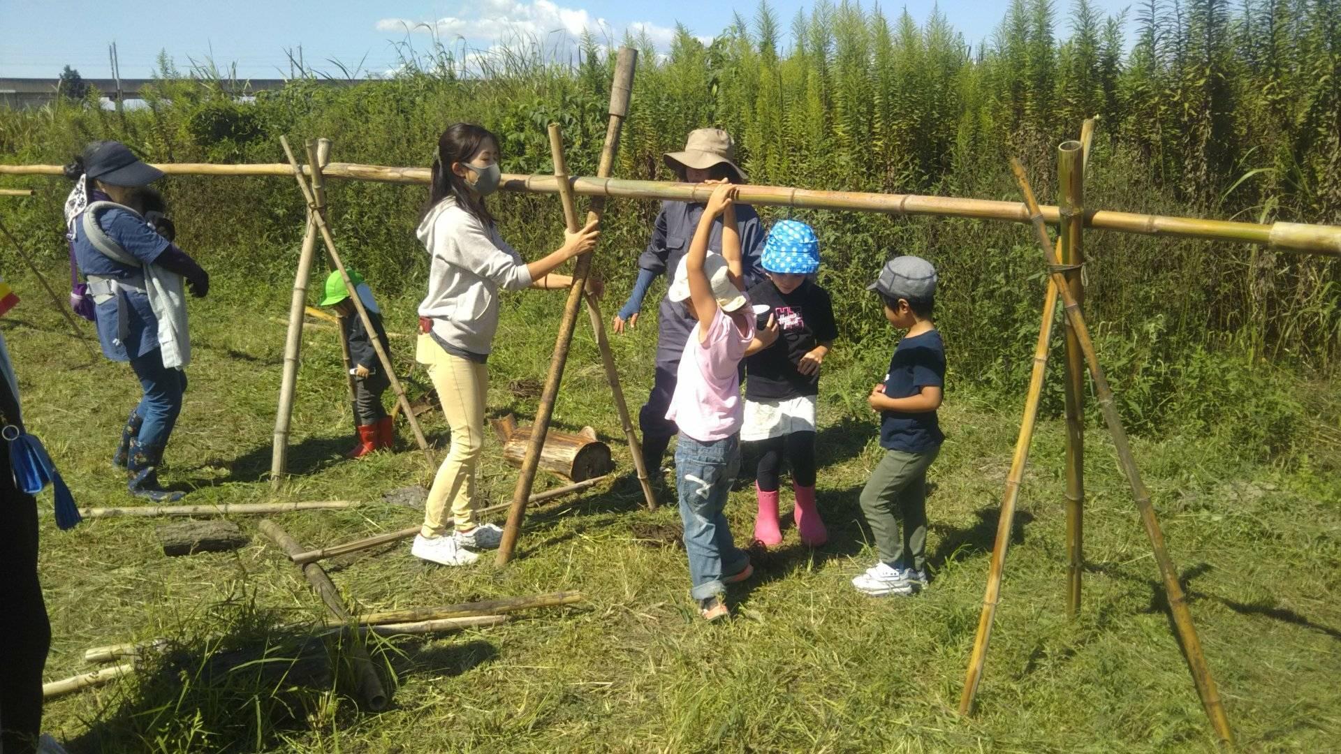 今週末の稲刈りを前に、みんなで稲架(はざ)を作りました!子どもたちも頑張りました。こういうことは本当に楽しそうです。この日は、久しぶりの日射と乾燥で、水筒の水かなくなる子続出(笑)竹で稲架(はざ)を 作るのは、実はかなり高度な技術が必要です。この近所では、足場パイプや、塩ビパイプなど、扱いが楽なもので作成することが多いです。簡単そうに見えて、形の違うものを目的に合うように、組み合わせる試行錯誤は、頭の体操のようで意外と楽しいものです。昔の人は、こうした知恵を駆使して、環境にインパクトの少ない部材で生活の基盤を支えました。再現していると私自身が楽しいので、お手伝いしてくださった保護者の皆さんも楽しそうです。楽しそうな大人を見て、子どもたちが楽しくないわけありません!