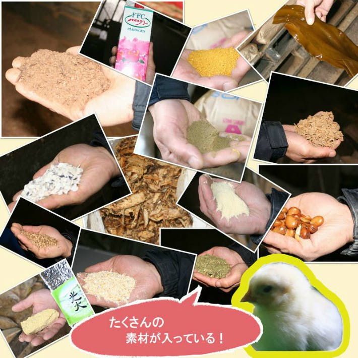 昆布やカツオなどを含むうどんだしをメインに、トウモロコシ、牡蠣殻など様々な素材を20品目以上使用。さらに、海藻粉末・ニンニク・魚粉もプラスすることで、味の濃厚な卵に仕上がります。また、エサにニンニクを入れることで、体の強い鶏になり、より栄養価の高い卵を産むようになります。