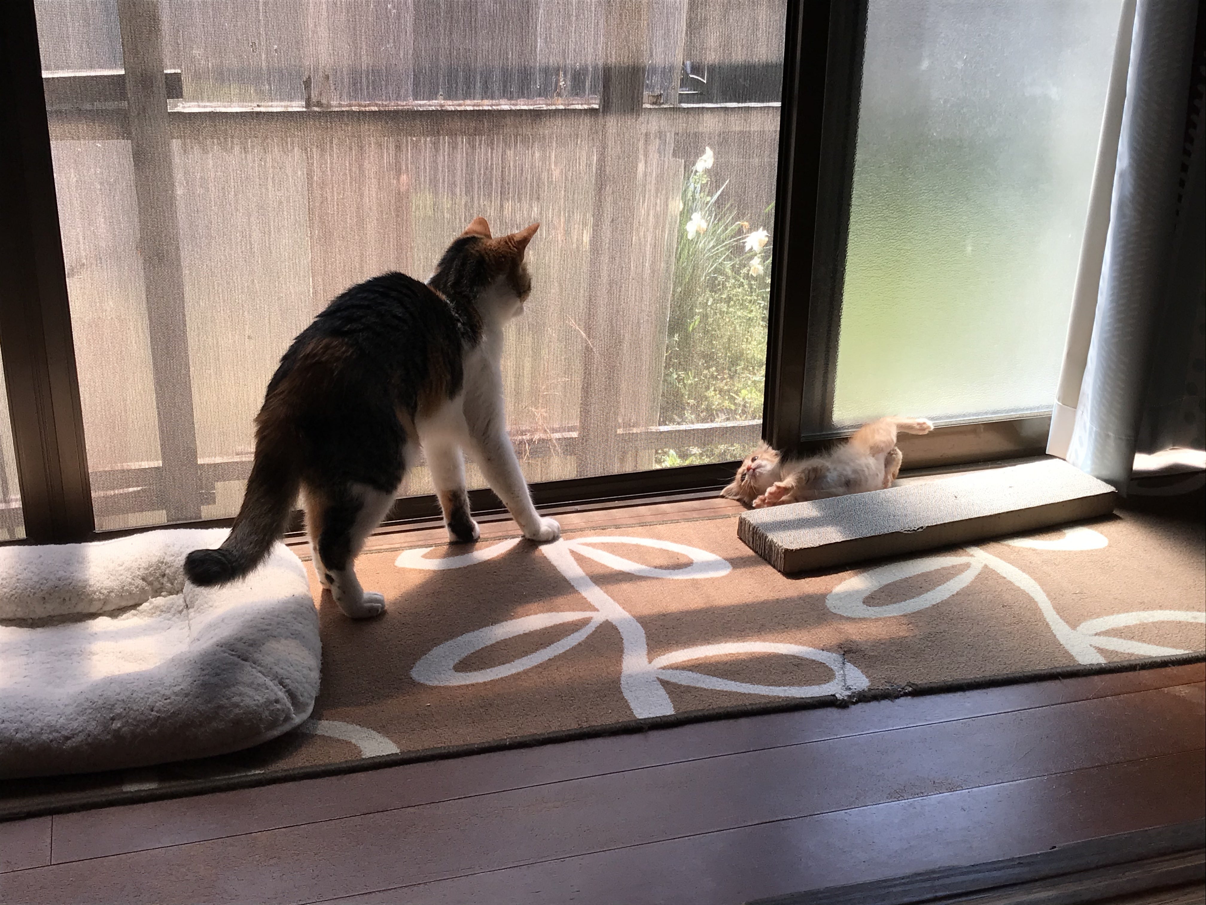 保護した猫2匹(ミケ推定4歳♀と茶トラ推定6ヶ月♂)と一緒に暮らしています。
