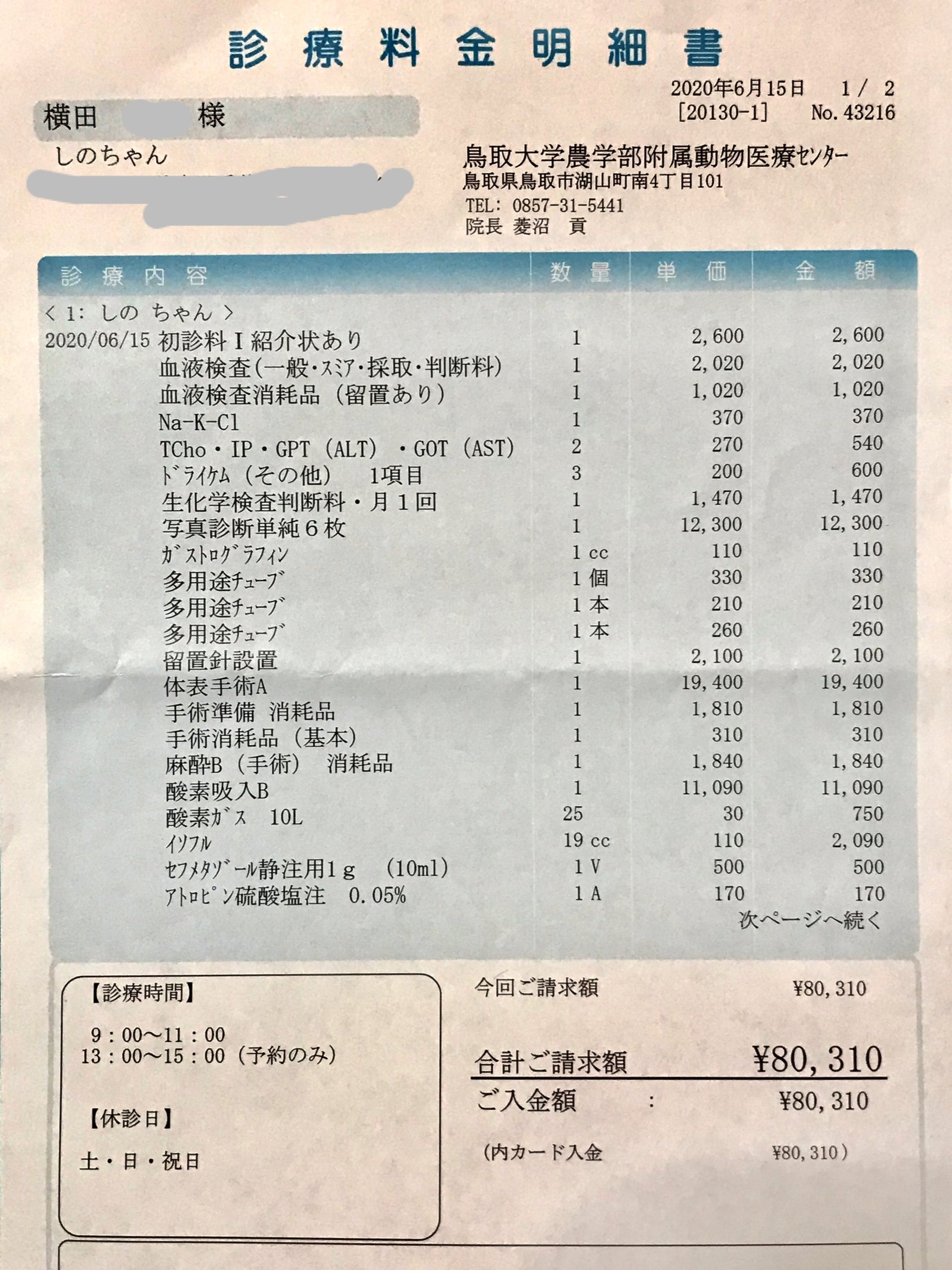 2020/11/23 12:2511月23日現在の収支報告をお知らせいたします。先月の直腸脱の切除・固定術に高額な医療費がかかりました。正直、会計のときに気が遠くなりそうでした…( ;∀;)それでも元気に生きているシノちゃん、手術が必要となる度にいろいろ飼い主としては考えさせられます。と、暗い話になってしまいましたが、今のシノちゃんがあるのは皆様のおかげです。今後もシノちゃんをよろしくお願いいたします。横田 もっと見る最近のシノちゃん