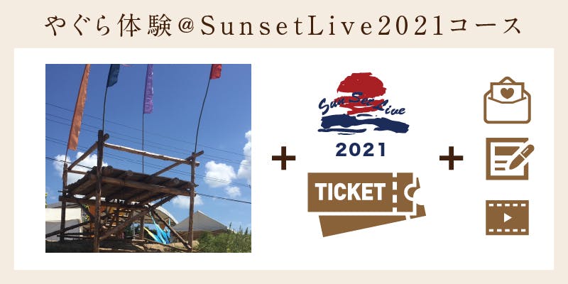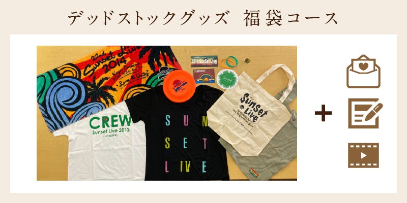 Tシャツ、エコバック、タオル、ステッカー、リストバンド、フリスビーなど過去のSunset Liveグッズの中から5点をセットにしたプランです。それぞれのTシャツサイズによって数に限りがあるのでぜひお早めに!