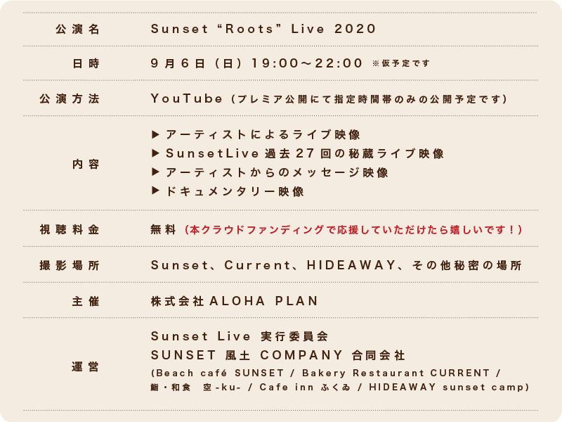 そこで今回、激ドキュメンタリー配信ライブ「Sunset “Roots” Live 2020」の開催をぜひ実現したいと思います。