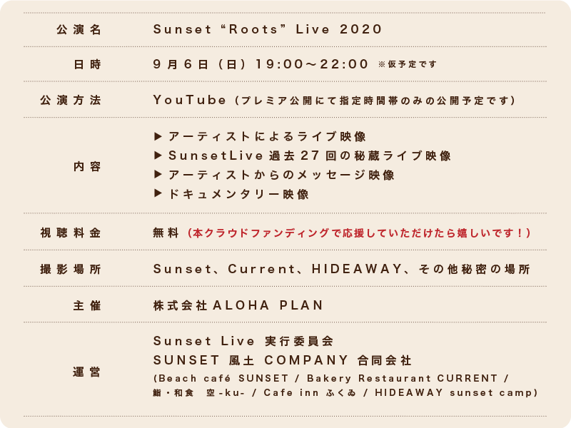 そこで今回、激ドキュメンタリー配信ライブ「Sunset “Roots” Live 2020」の開催をぜひ実現したいと思います。