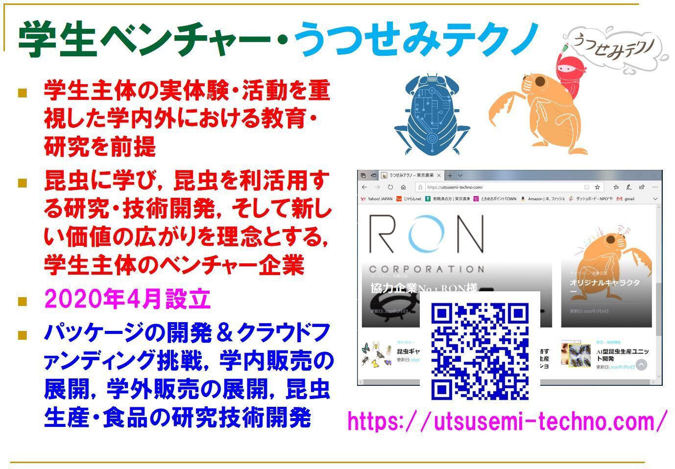 実際に社会問題を解決すべく学生ベンチャー企業・うつせみテクノを立上げました。うつせみテクノは東京農業大学の学生からなる合同会社であり2020年4月に設立したばかりですが、この問題を解決するコアとなるべく、バイオロボティクス研究室と一緒に新しい昆虫日本食・文化・農業を創出していきます。