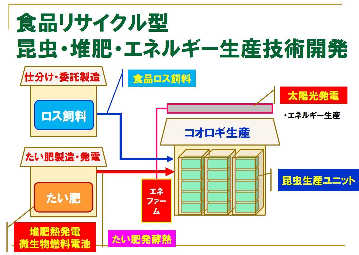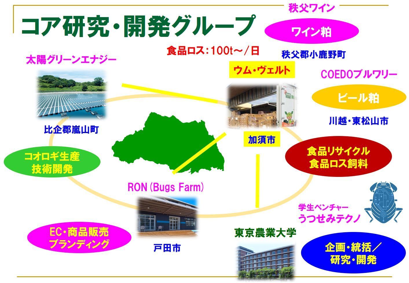 この第一歩として提案するプロジェクトは、食品ロスを用いた昆虫用エコフィードの設計・開発を食品リサイクル大手のウム・ヴェルト株式会社様、食用コオロギ生産については太陽グリーンエナジー株式会社様と協力して行い、農大・埼玉・山梨県産の食品ロスを活用した食用ブランドコオロギを開発するものです!