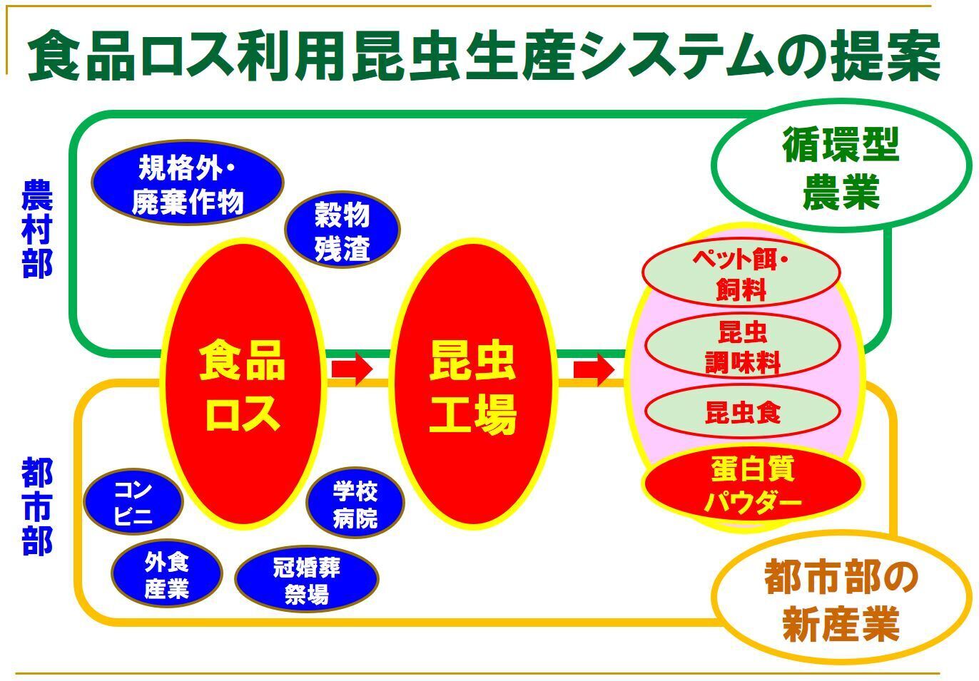 具体的には、昆虫を飼料としたナマズ・ザリガニなどの養殖、空き家を活用したコオロギ生産とエネルギーのハイブリット生産、それに伴う地方における新しい産業と雇用の創出なども目標とします。