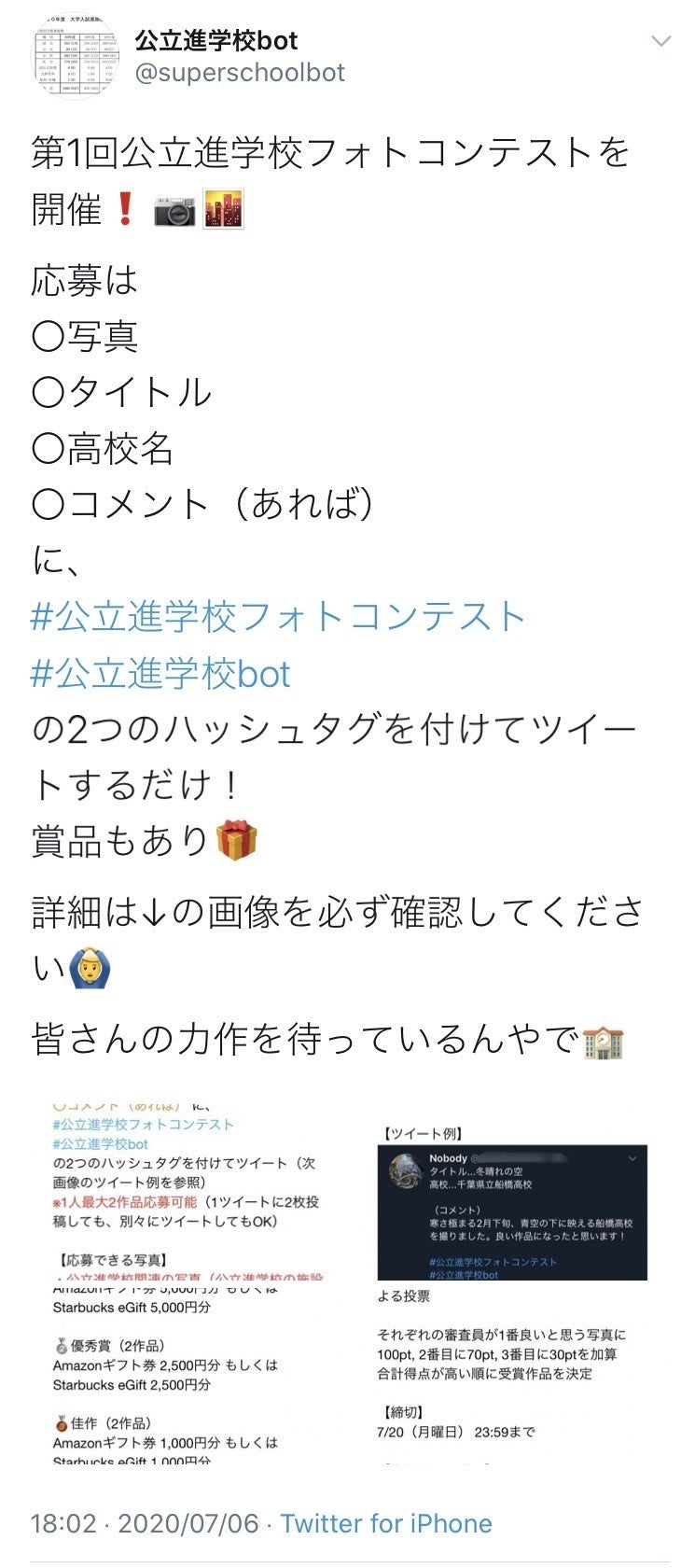 2020/09/08 18:52公立進学校bot(@superschoolbot)です。皆様にご支援いただいた公立進学校フォトコンテストですが、開催が無事終了いたしました。ご協力、本当にありがとうございました!受賞作品はこちらからご確認いただけます。https://twitter.com/superschoolbot/status/1303257108951887873また、Twitterで #公立進学校フォトコンテスト のハッシュタグで検索していただくと、応募された作品を見ることができますので、ぜひご覧になってください。投稿の数も多く、当初の想定よりも遥かに盛り上がるイベントにすることができ、大変嬉しく思っています!これからもイベント等を開催して公立進学校を盛り上げたいと思っておりますので、今後とも公立進学校botをよろしくお願い申し上げます。公立進学校bot(@superschoolbot) もっと見る