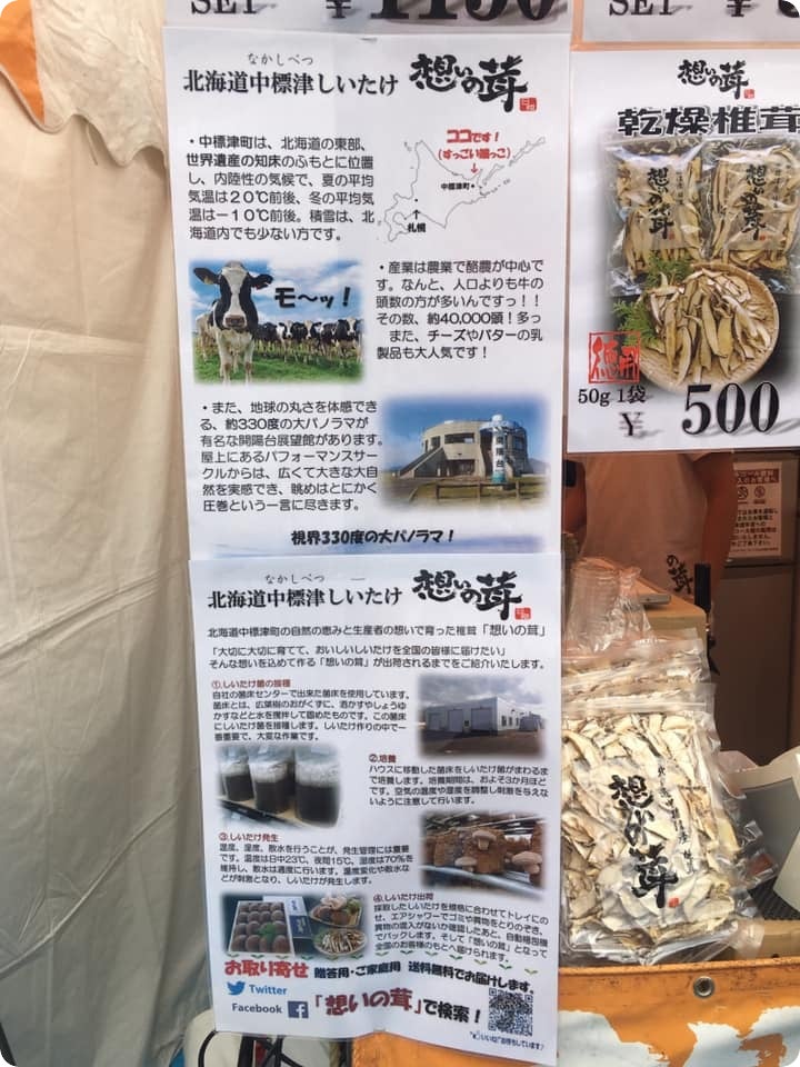 「北海道フェア in 代々木」や「地元めしクオーゼイ in 日比谷」では、中標津町代表として出店させていただいており、「想いの茸」はもちろんのこと、中標津町のPRもさせて頂いてます。