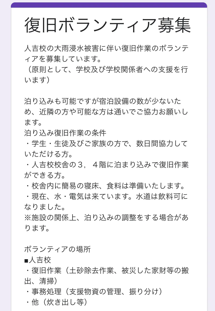 人吉校の大雨浸水被害に伴い復旧作業のボランティアを募集しています