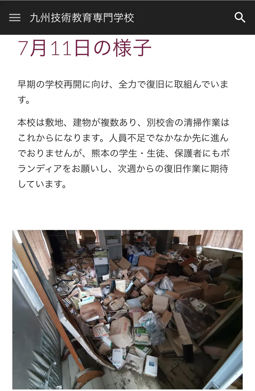 本校は敷地、建物が複数あり、別校舎の清掃作業はこれからになります。人員不足でなかなか先に進んでおりませんが、熊本の学生・生徒、保護者にもボランディアをお願いし、次週からの復旧作業に期待しています。