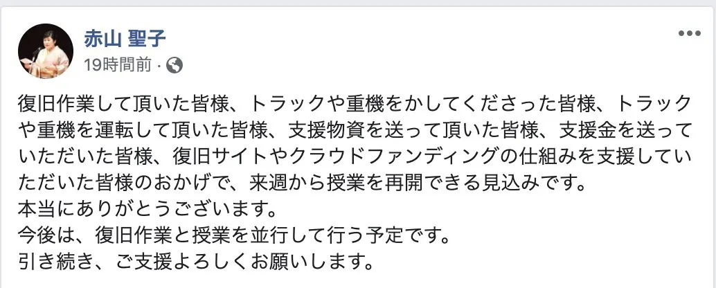 復旧作業して頂いた皆様、トラックや重機をかしてくださった皆様、トラックや重機を運転して頂いた皆様、支援物資を送って頂いた皆様、支援金を送っていただいた皆様、復旧サイトやクラウドファンディングの仕組みを支援していただいた皆様のおかげで、来週から授業を再開できる見込みです。