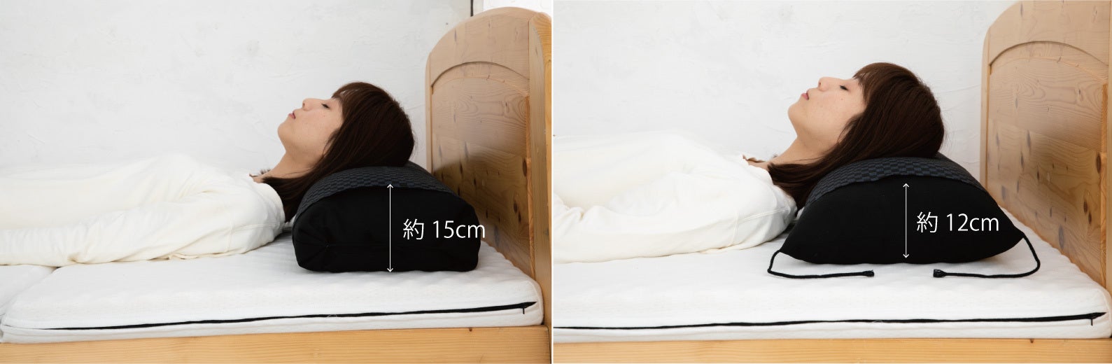 枕の高さが約15cmあるので、肩が邪魔になりにくく、横向きで寝る方には最適な高さです。横向き寝は、イビキ軽減にも期待できます。