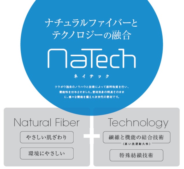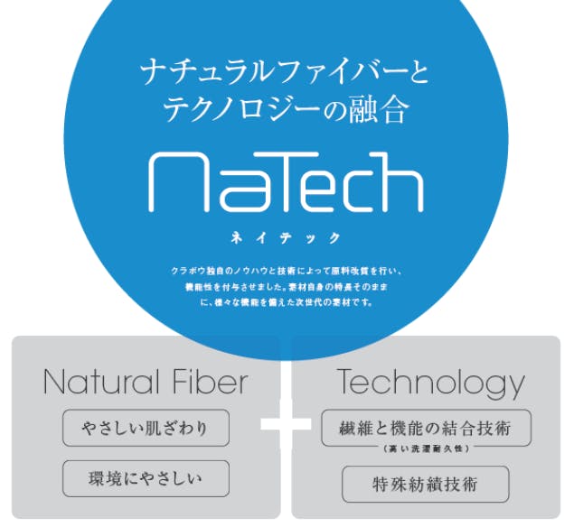 Natural(ナチュラル=天然由来の素材)とTechnology(テクノロジー=新しい機能の付与)により、天然由来の繊維の優しさと高い機能性を両立した、新機軸の素材です!