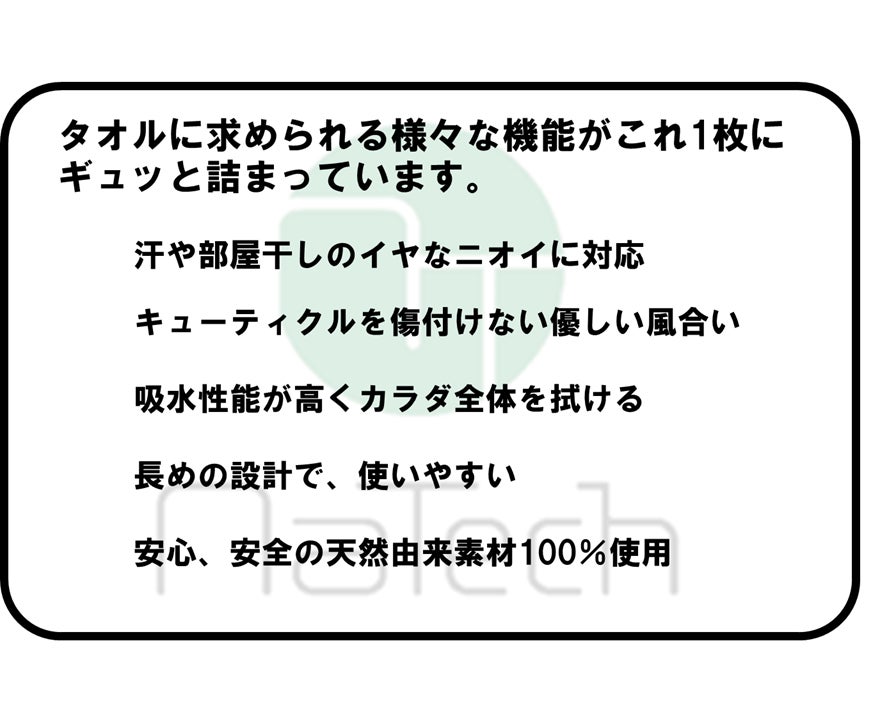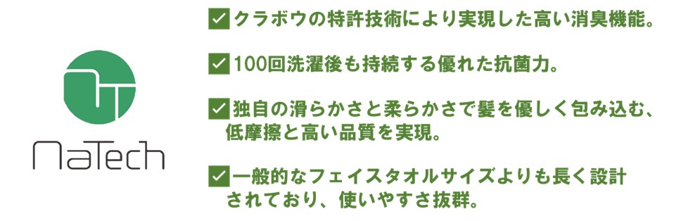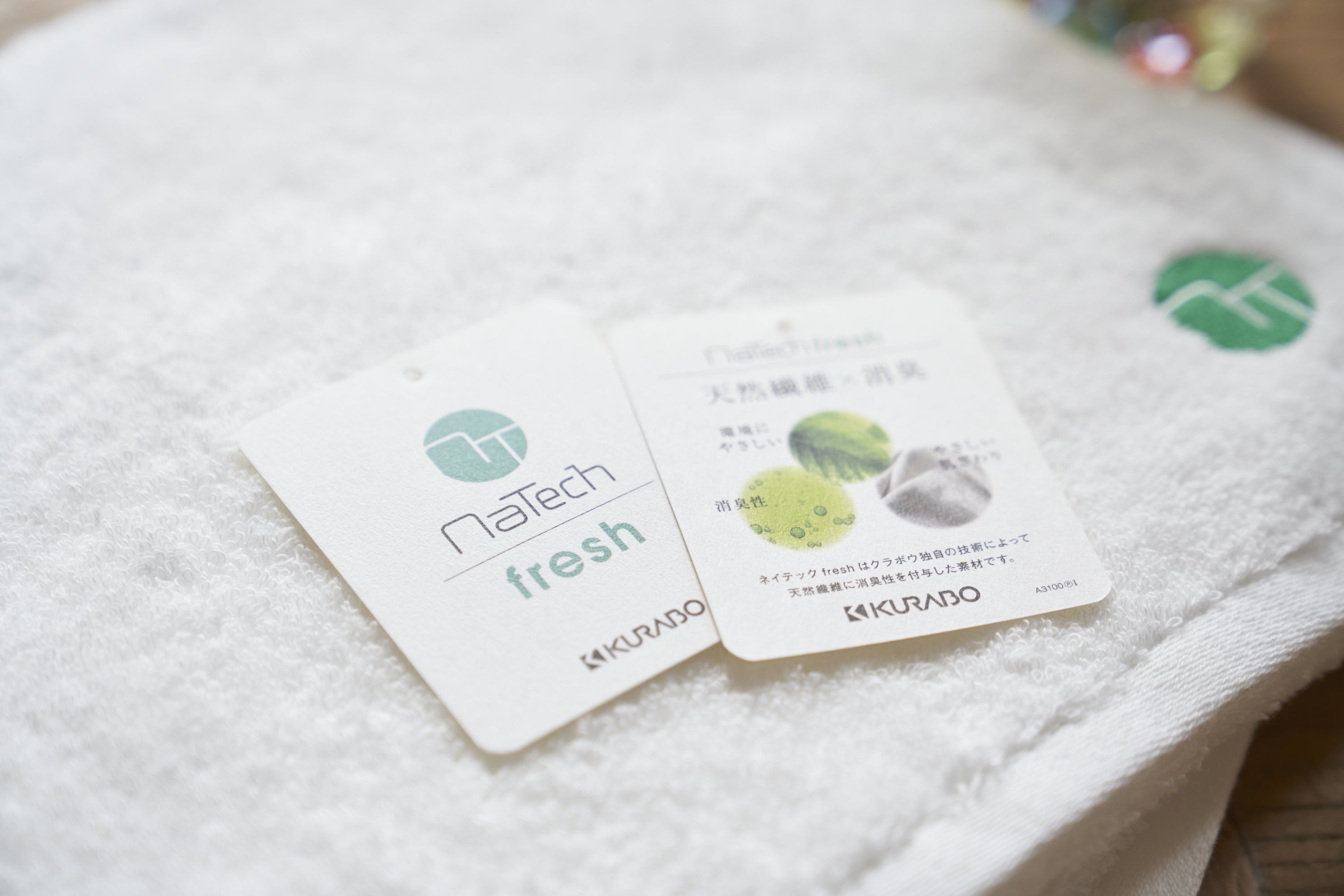 ALL IN ONE タオルには、クラボウの特許技術「NaTech fresh」綿を使用しております。NaTechは、倉敷紡績株式会社(クラボウ)のブランドとして、2019年に誕生した新しい技術の素材になります。