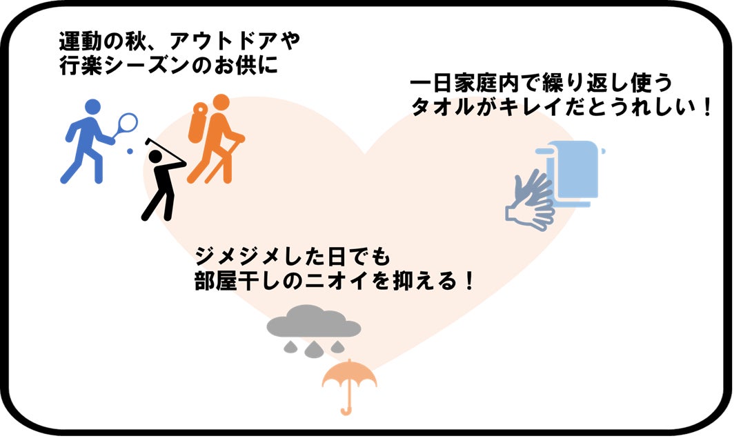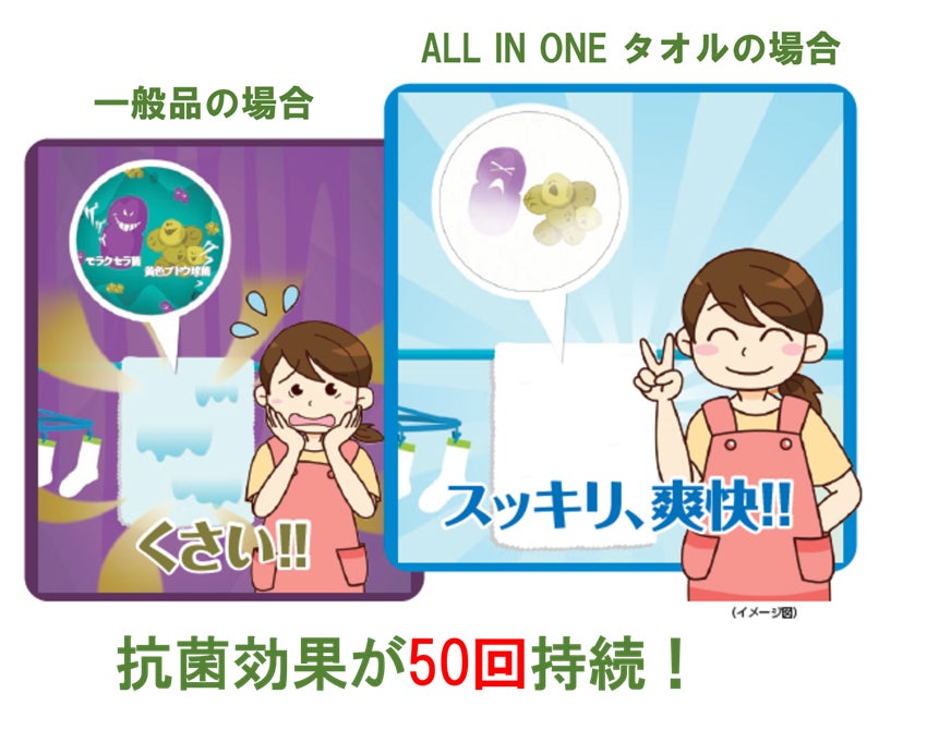 放置したままでいると嫌なニオイが発生するタオル、ALL IN ONE タオルなら、菌等ニオイの元を抑え、曇り時や夜の部屋干し時にも臭わない!
