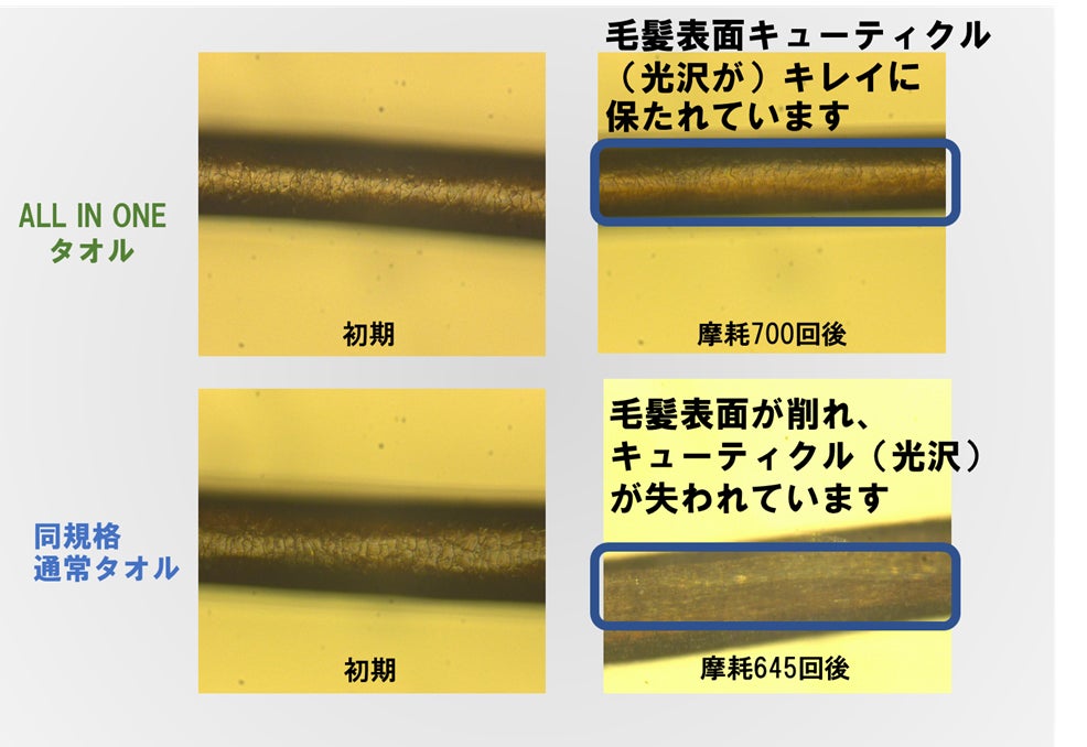 同規格の通常タオルとのキューティクル摩耗試験結果比較。比較用の通常タオルでは摩耗後髪表面が削れ、光沢も失われているのに対し、ALL IN ONE タオルは700回摩耗後もピカピカの光沢を保っています!