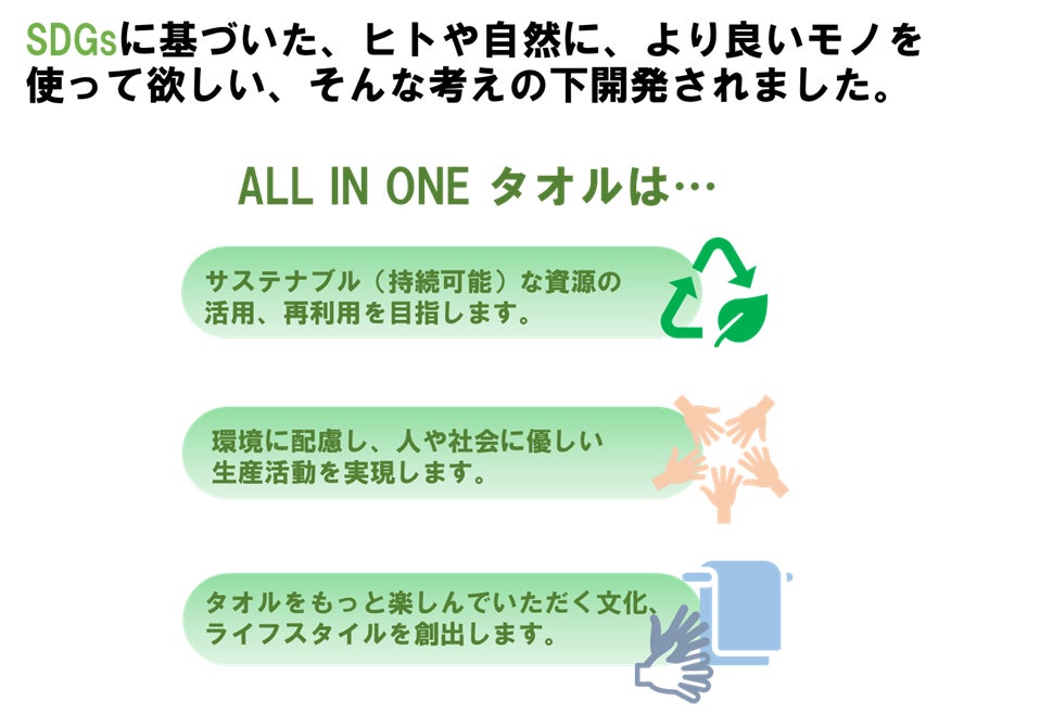 ALL IN ONE タオルは、今までのタオルの不満を解消し、様々なシーンで爽やかに心地よくご使用いただける製品を目指して開発されました!