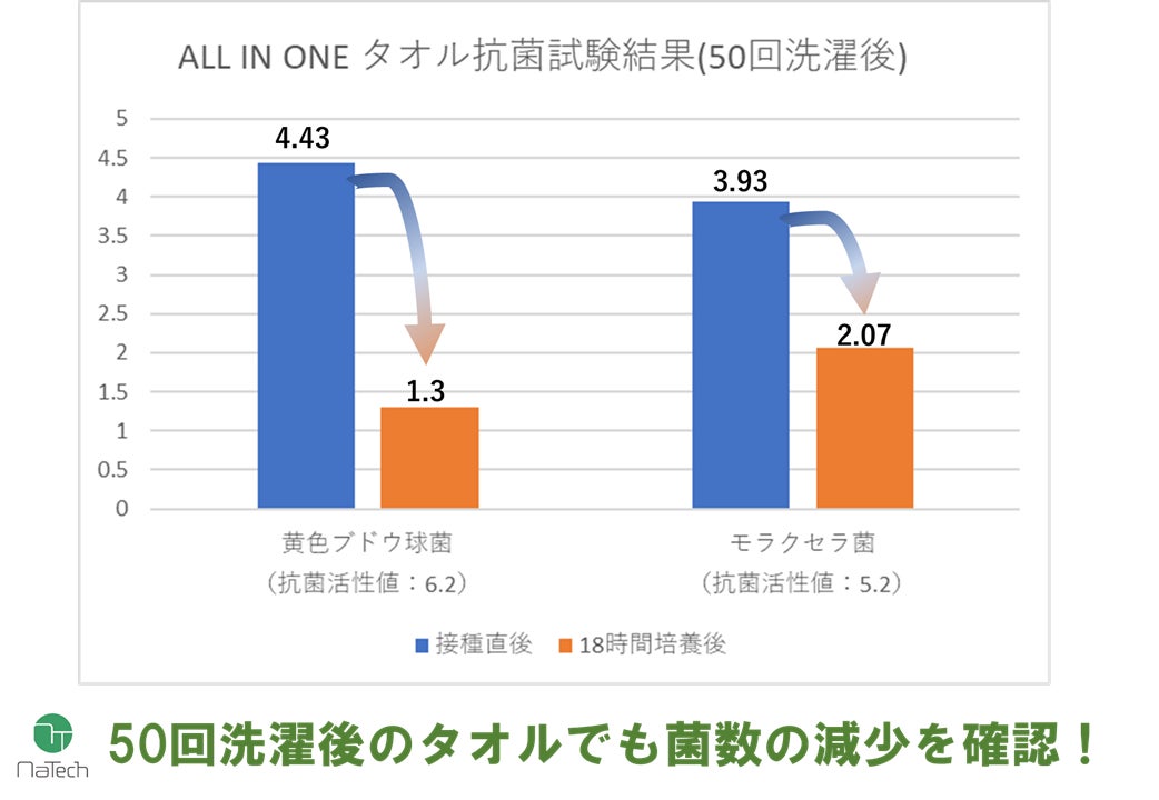 一般的に抗菌機能の証明には、抗菌活性値2.2以上必要ですが、ALL IN ONE タオルは50回洗濯後の抗菌活性値が、黄色ブドウ球菌で6.2、モラクセラ菌で5.2と、非常に高い抗菌機能が確認されています!