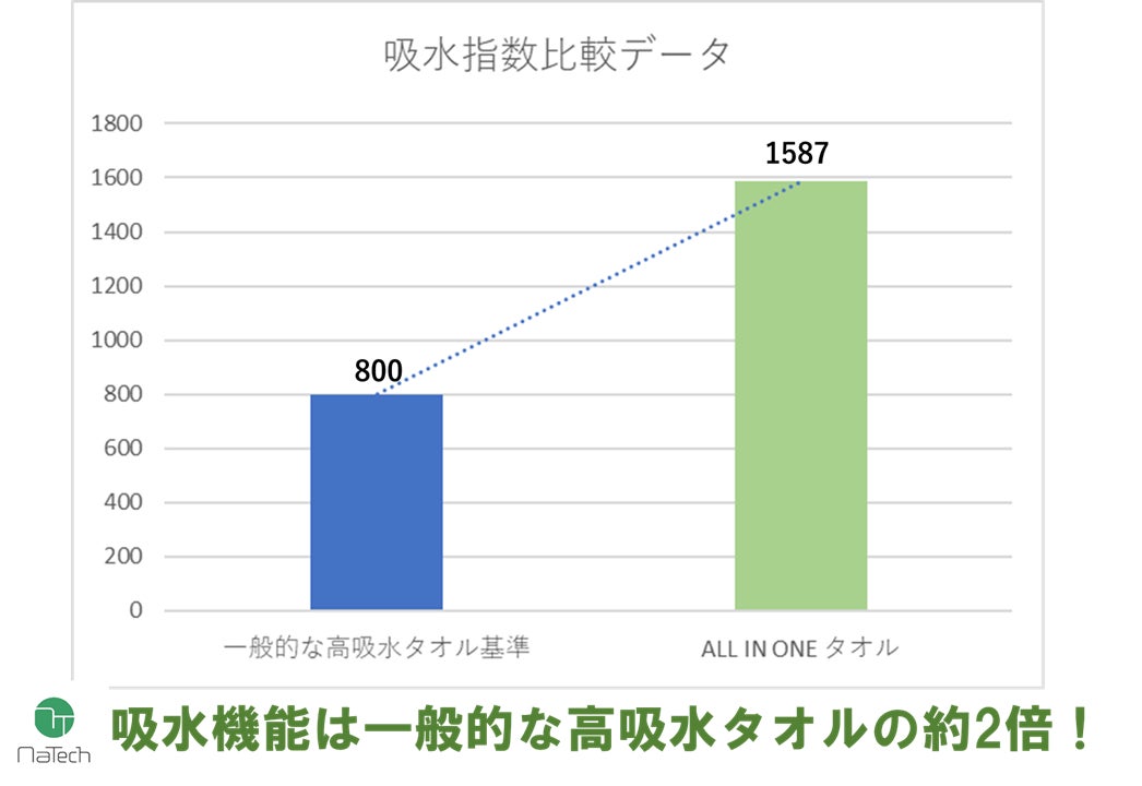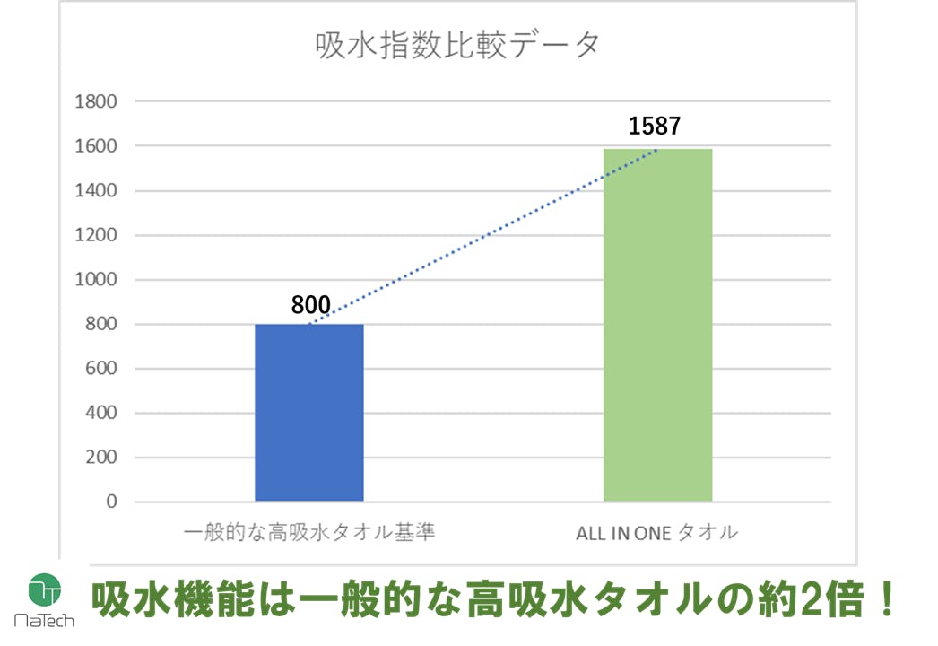 ALL IN ONE タオルの吸水指数は、一般的な高吸水タオルと比較し約2倍の高さ!髪やカラダの水分をしっかり吸水します!