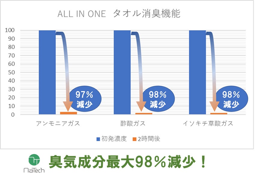 ALL IN ONE タオルはそれらすべてのニオイに対応、10回洗濯後も臭気成分をなんと最大98% 減少させます。