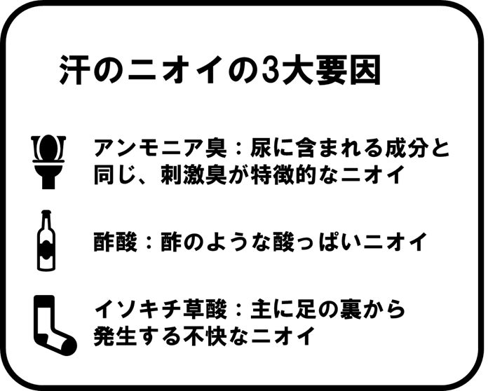 汗の嫌なニオイの主な要因は、「アンモニア臭」、「酢酸臭」、「イソキチ草酸 (そうさん)臭」と言われています。