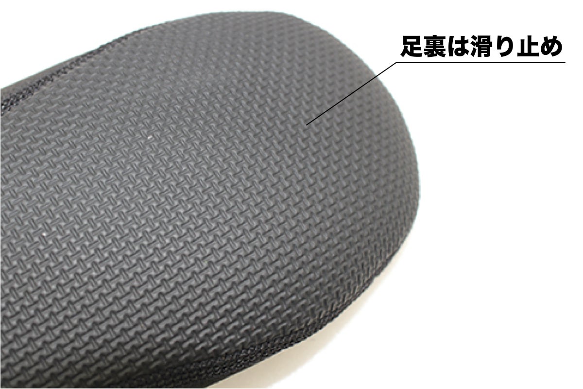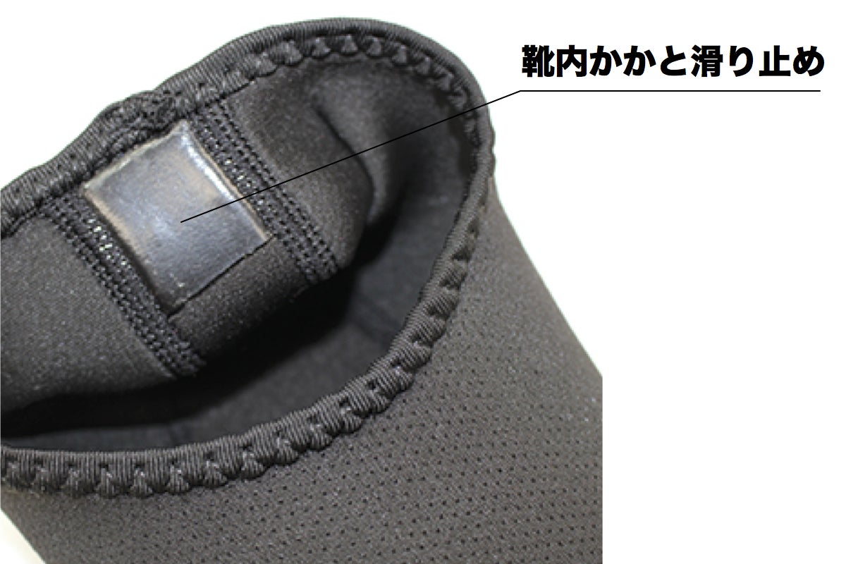 靴下やスリッパだと何かの拍子にすぐ脱げてしまうデメリットを解消するため、かかとの内側に滑り止めを施し脱げにくい様にいたしました。