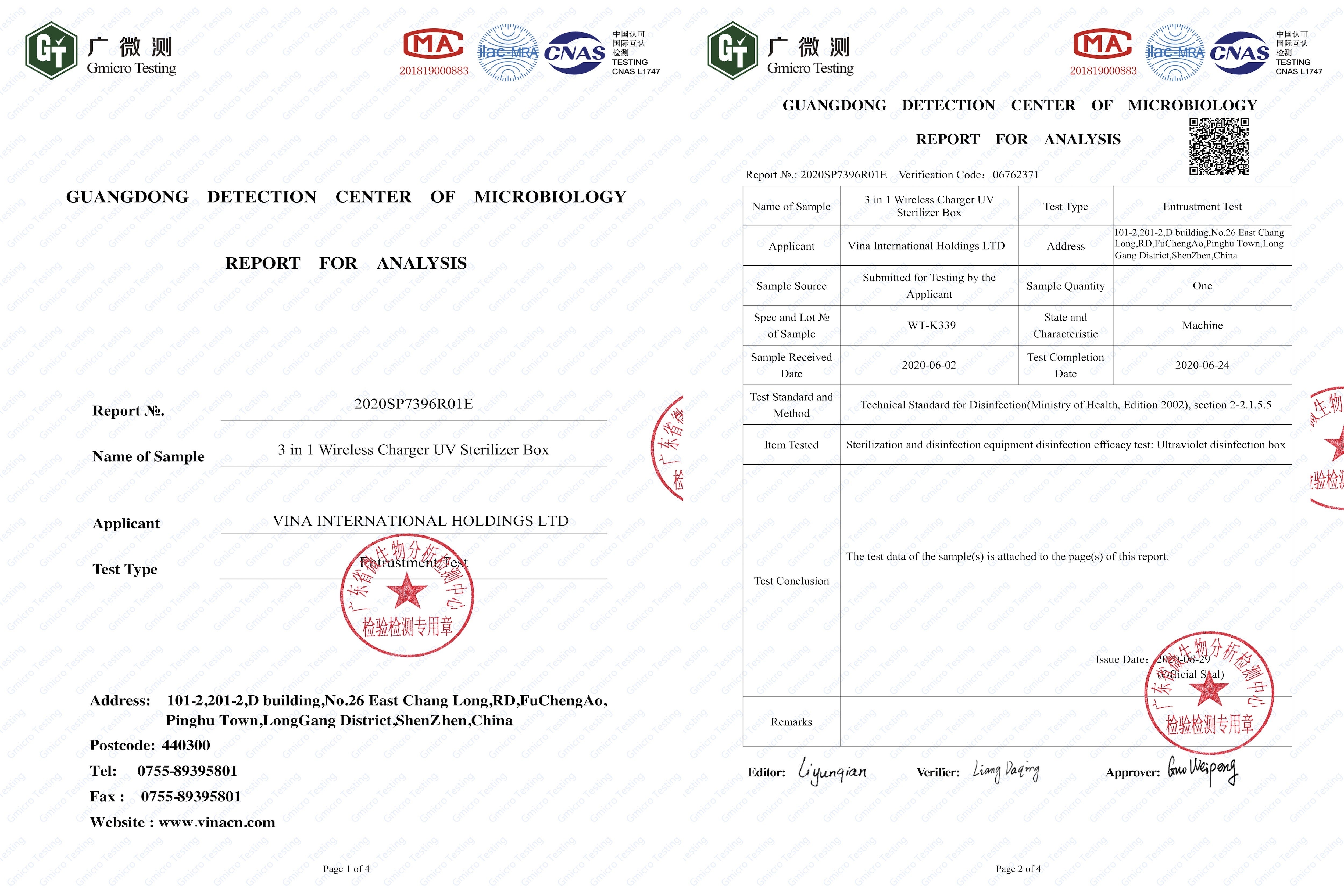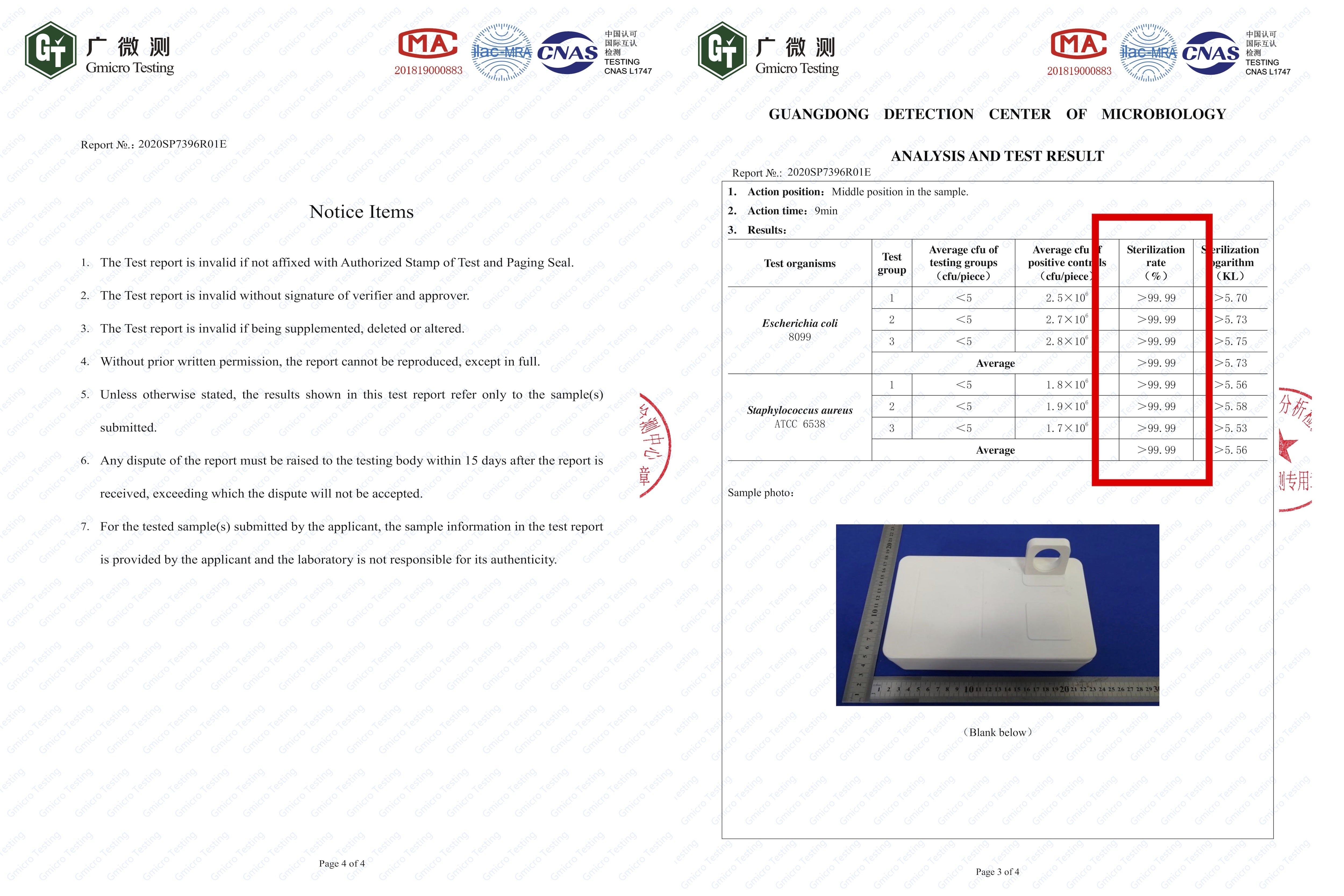 上記の証明レポートは既に2020年6月24日に取得できました。未だ世界に流通していない最新のプロダクトです!赤枠で囲んである部分に記載の通り、除菌率は99.9%以上ということが証明されています。