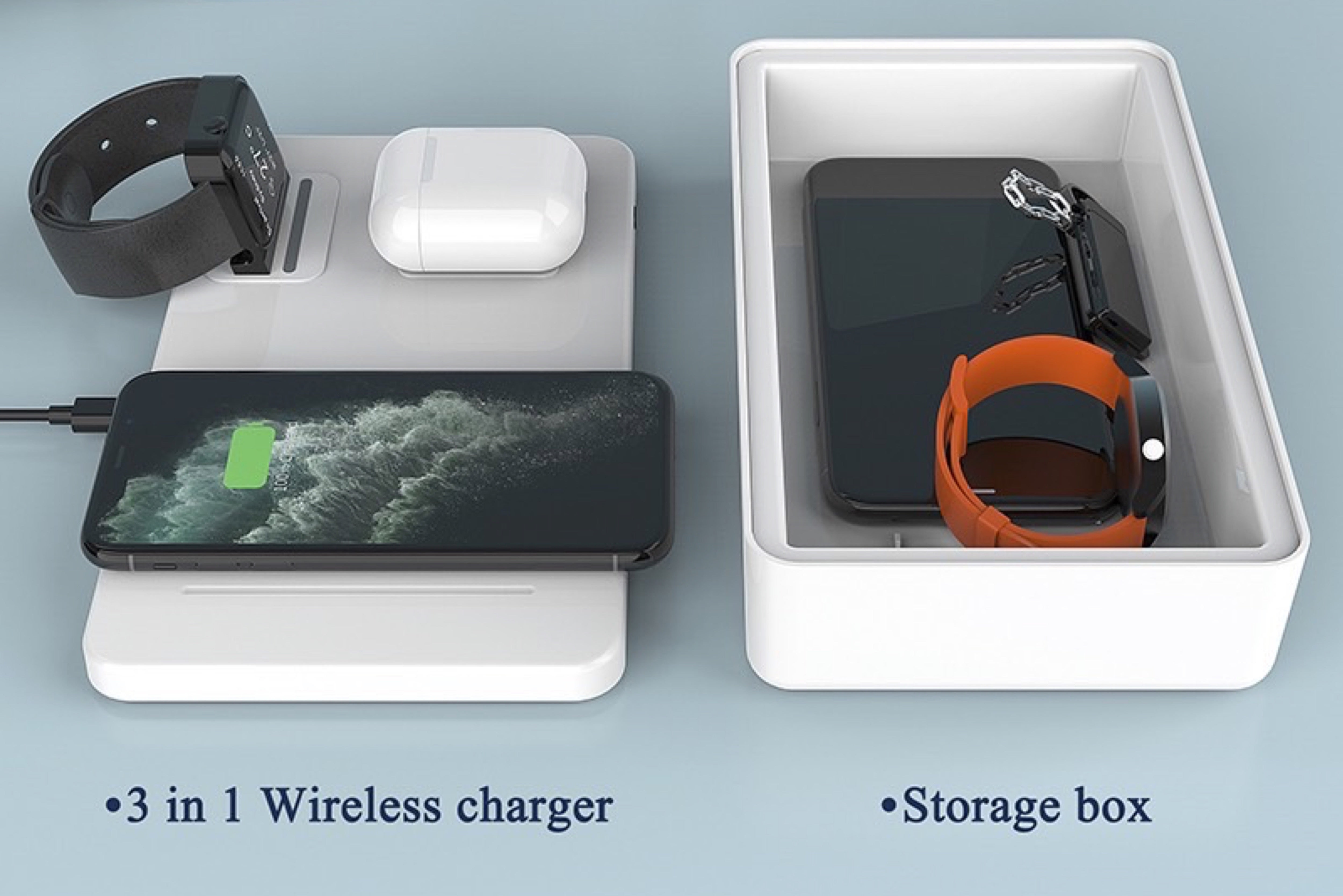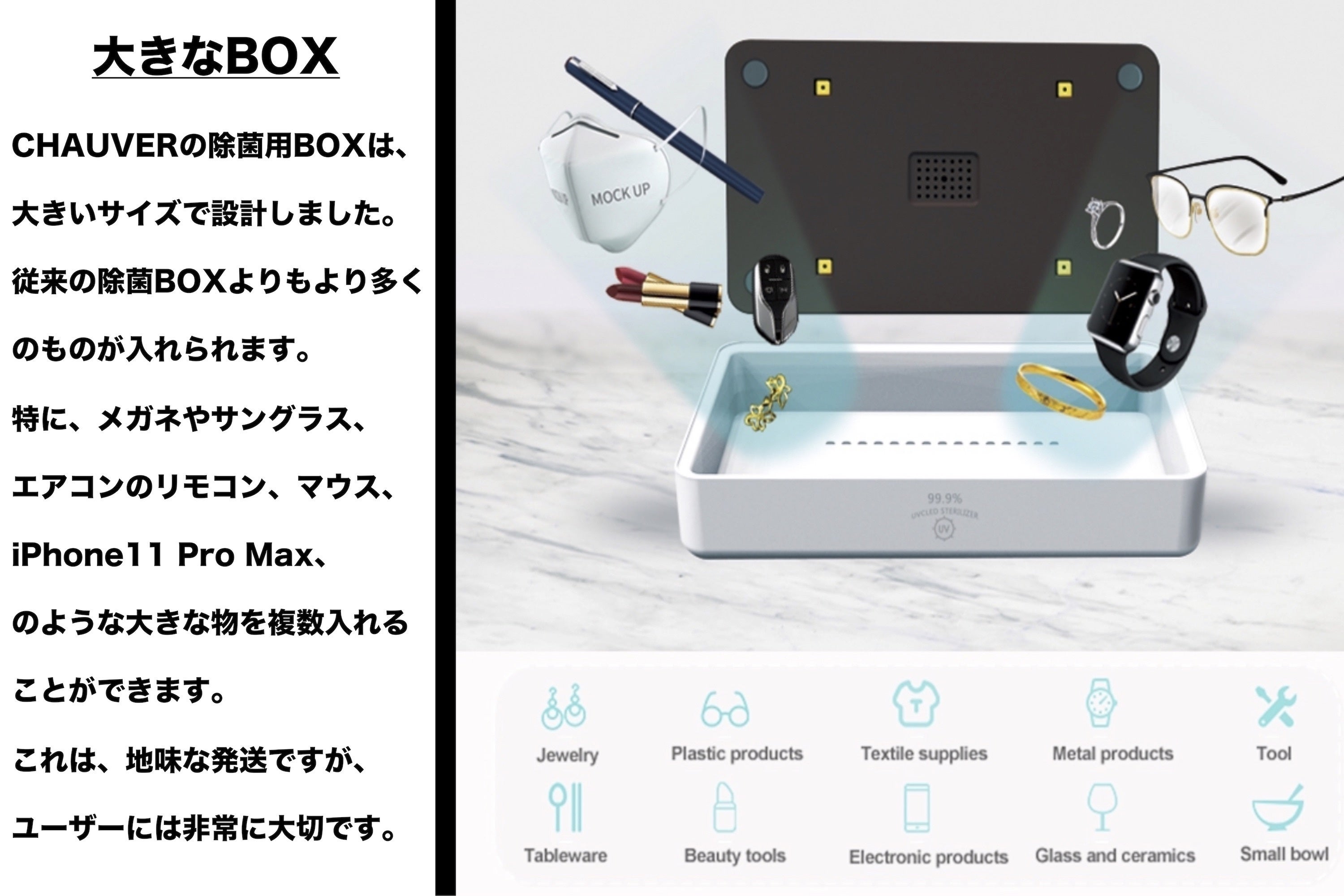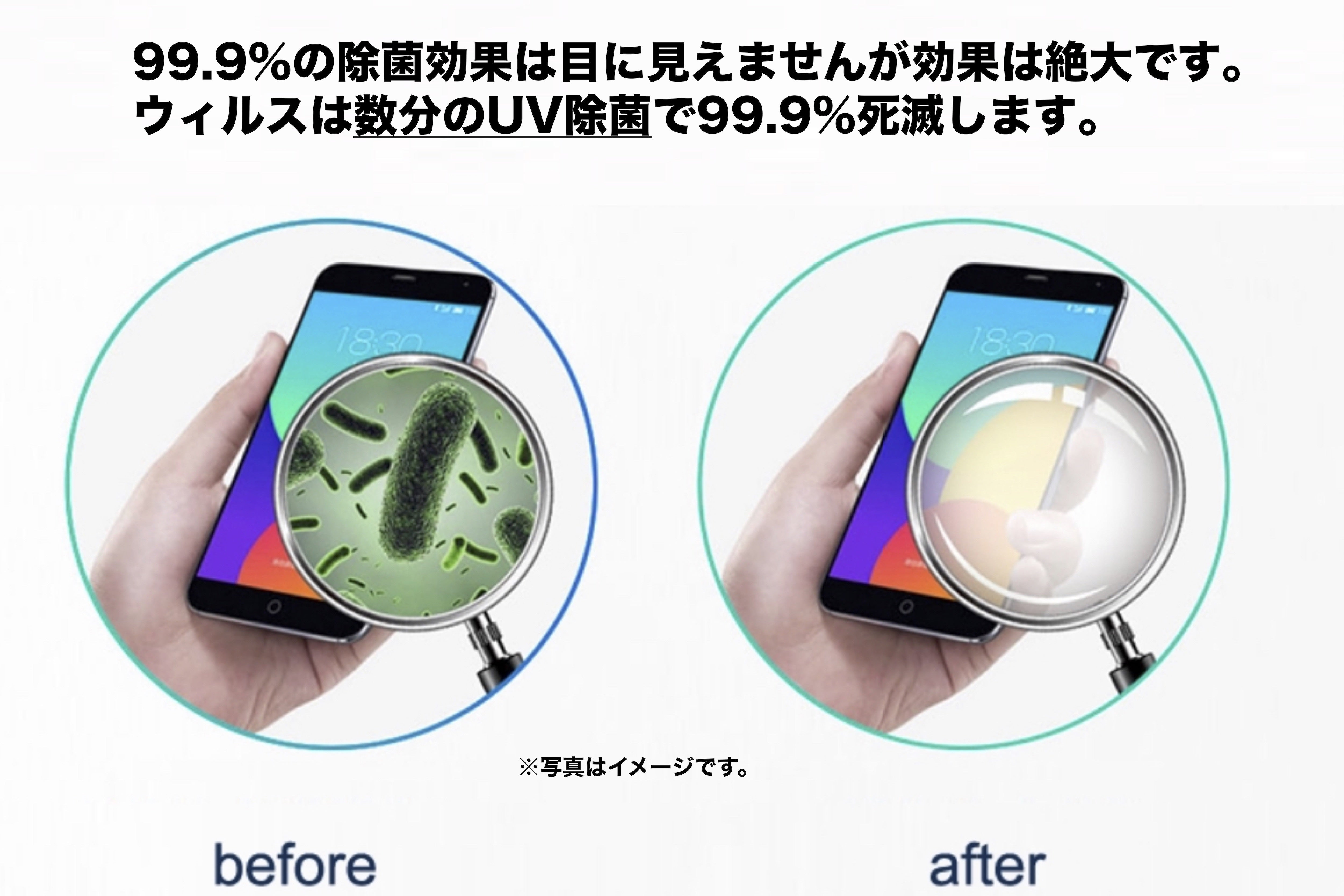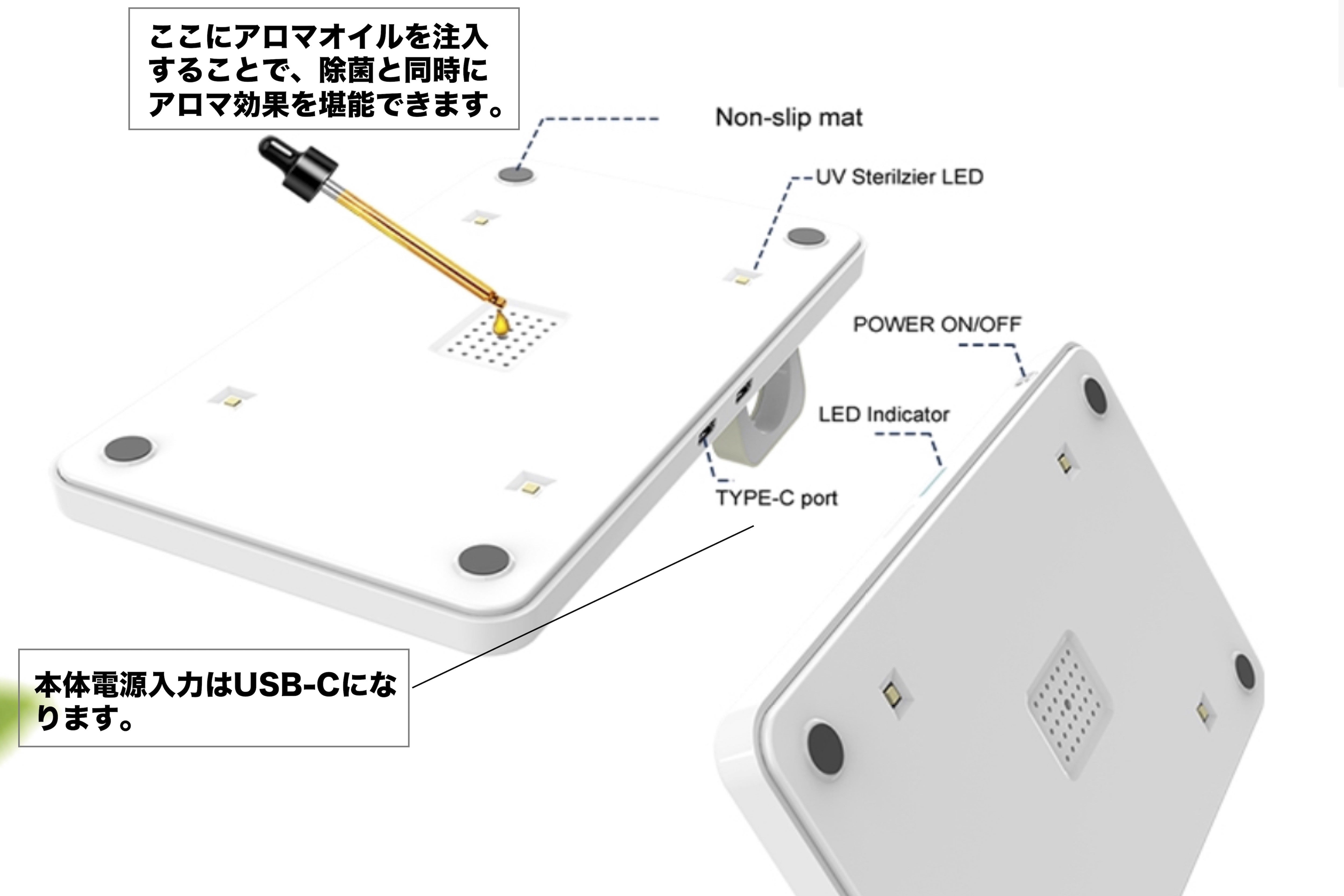 アロマオイルを注入できる除菌ボックスは世界でも類を見ません。またUSB-C入力ポートであることから高速充電が可能な設計になっております。