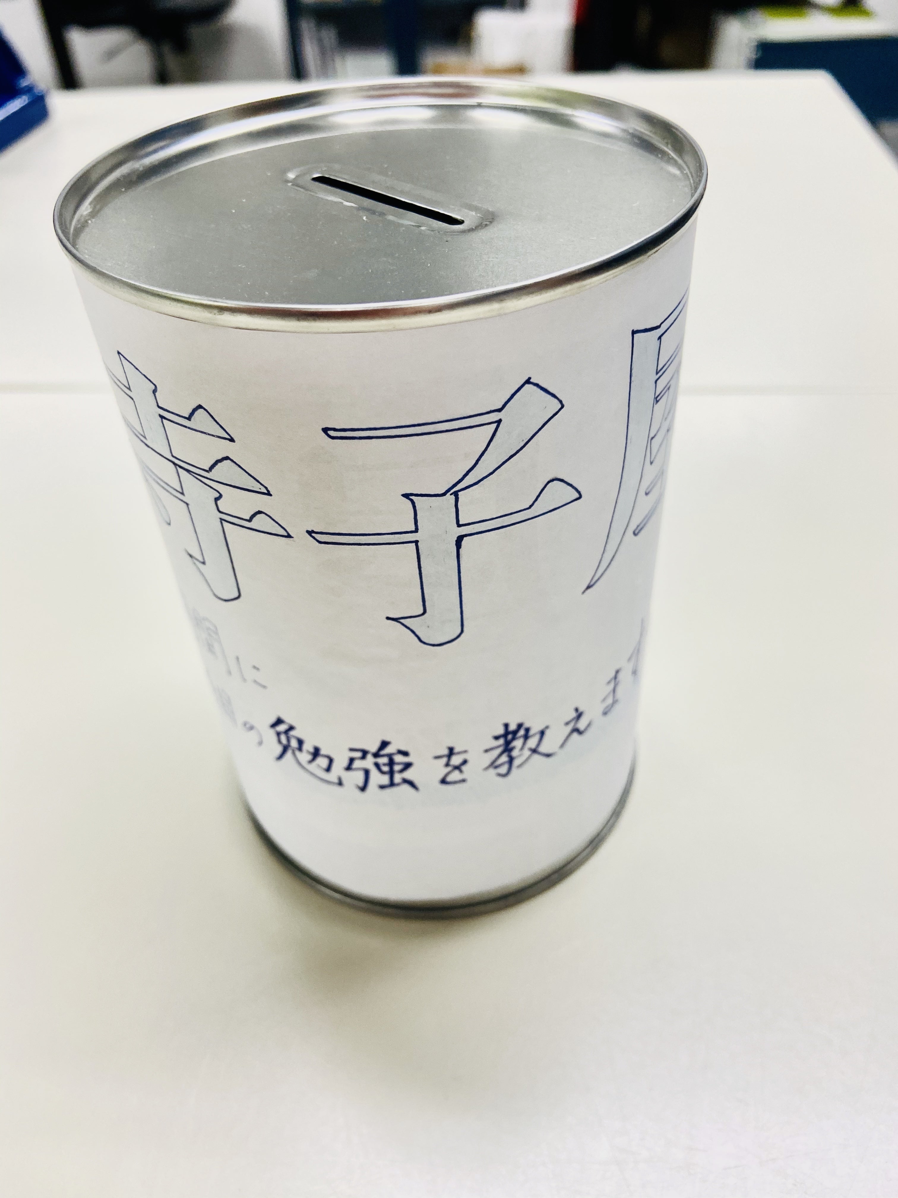 岸和田でいかせていただいた店舗さんの中で、ある居酒屋さんのご主人に写真のような貯金箱をいただきました!もともとはお店の中でご主人がご本人やご家族のためにお客様から集めていたものだったそうなのですが、企画を知ったご主人は「こういうことするんやったら色々お金かかるやろ!これに企画の内容貼って持って回ってちょっとずつでもお金集めてき!」とめちゃくちゃ男前なことをおっしゃってくださったのでありがたく頂戴し、下の写真のように企画の内容を簡単に記載した紙を巻きつけました。いただいた貯金箱の中には3000円ほど入っているそうで、現在はこれを持ち歩きつつ仲良くさせていただいている方々に支援のお願いに奔走しています。これだけでなく、寺子屋に関するチラシをお店の前に1m×2mほどの大きなパネルいっぱいに拡大して掲示してくださっています!