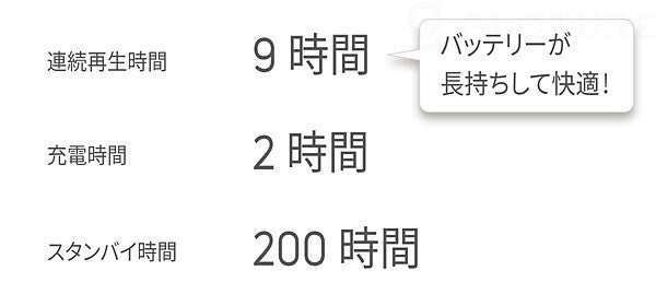 ● 連続再生時間はなんと9時間!ケース使用時は最長60時間!圧倒的なバッテリー容量