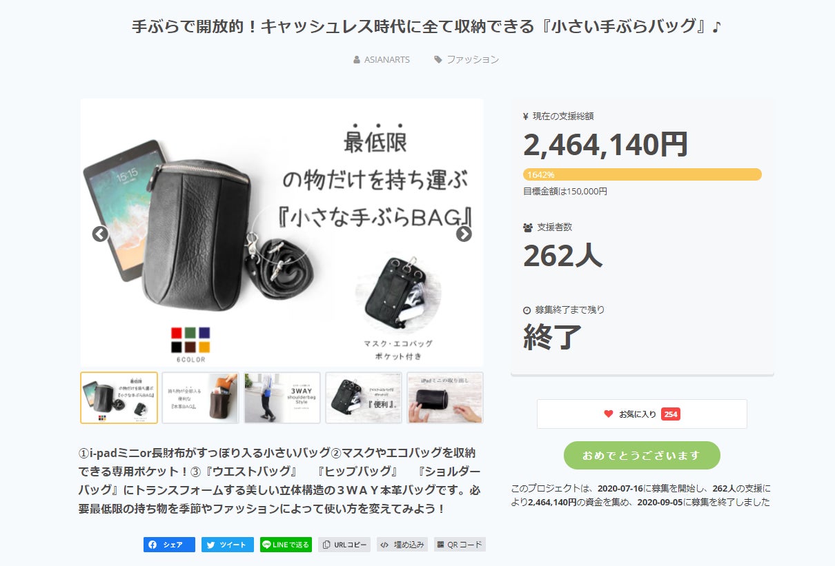 2020/11/16 18:51「必要最低限の物を持ち運ぶ『小さいBAG』第2弾」プロジェクトオーナーのASIANARTSです。この度は沢山のご支援頂きまして本当にありがとうございます。本日クラウドファンディングが終了し皆様のおかげで、目標金額980%のご支援を得ることができました。現在の支援総額:1467780支援者数:221※詳細はこちらからご覧いただけます。https://camp-fire.jp/projects/view/305665プロジェクトが終了致しましたので、今後支援者の皆様へ順次リターンのご対応をさせていただきます。只今第1弾の生産が完了し、第2弾分もまもなく生産生産が完了する見込みです。第1弾分(早割)は工房より既に弊社に届いておりますので、次第リターン発送させて頂き再度ご報告させて頂きますので今暫くお待ち頂ければ幸いです。それでは、引き続きよろしくお願いいたします。今後のプロジェクトの進捗や状況については、プロジェクトページの「活動報告」にて投稿していきます。改めて、ご支援いただきまして誠にありがとうございます。 もっと見る