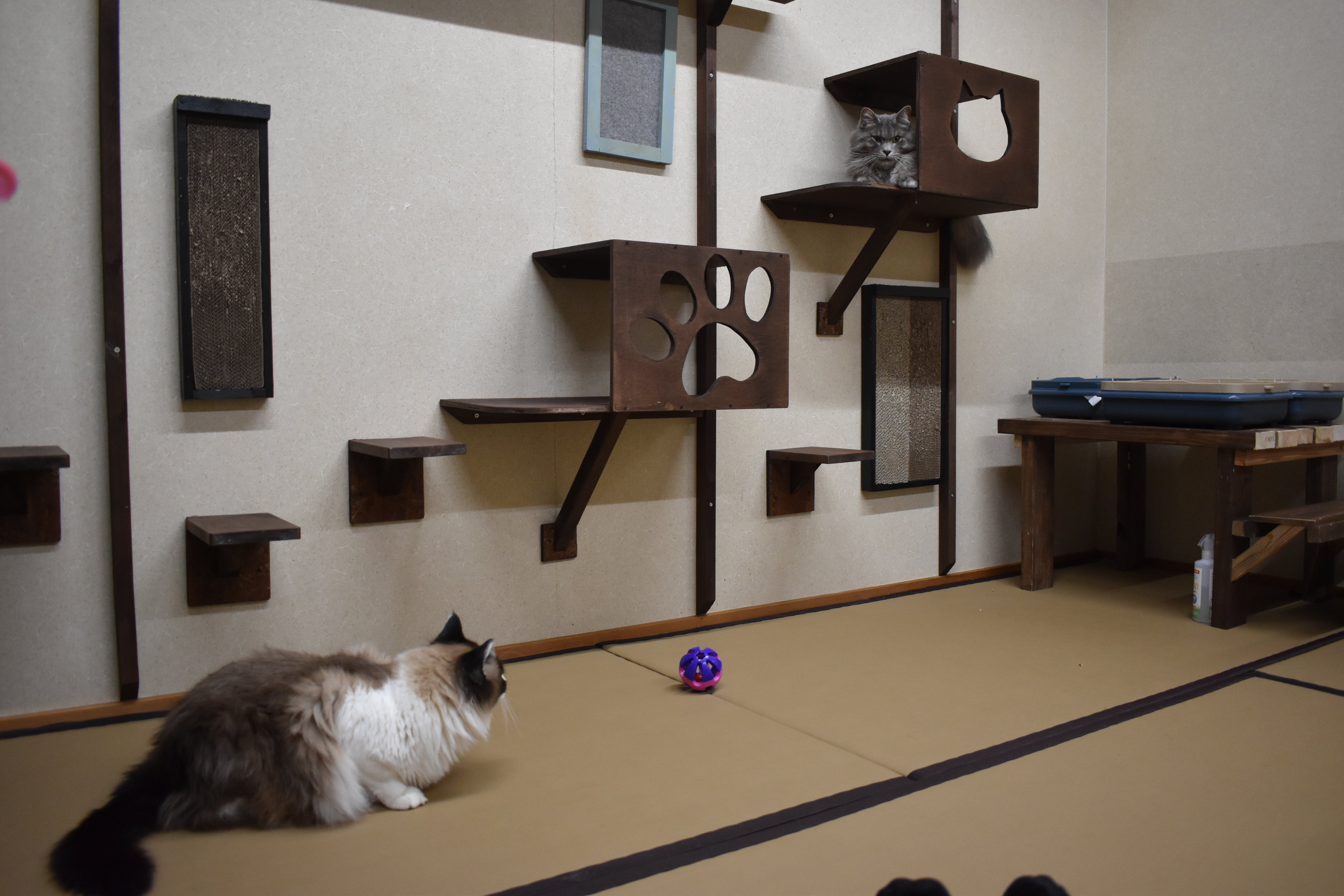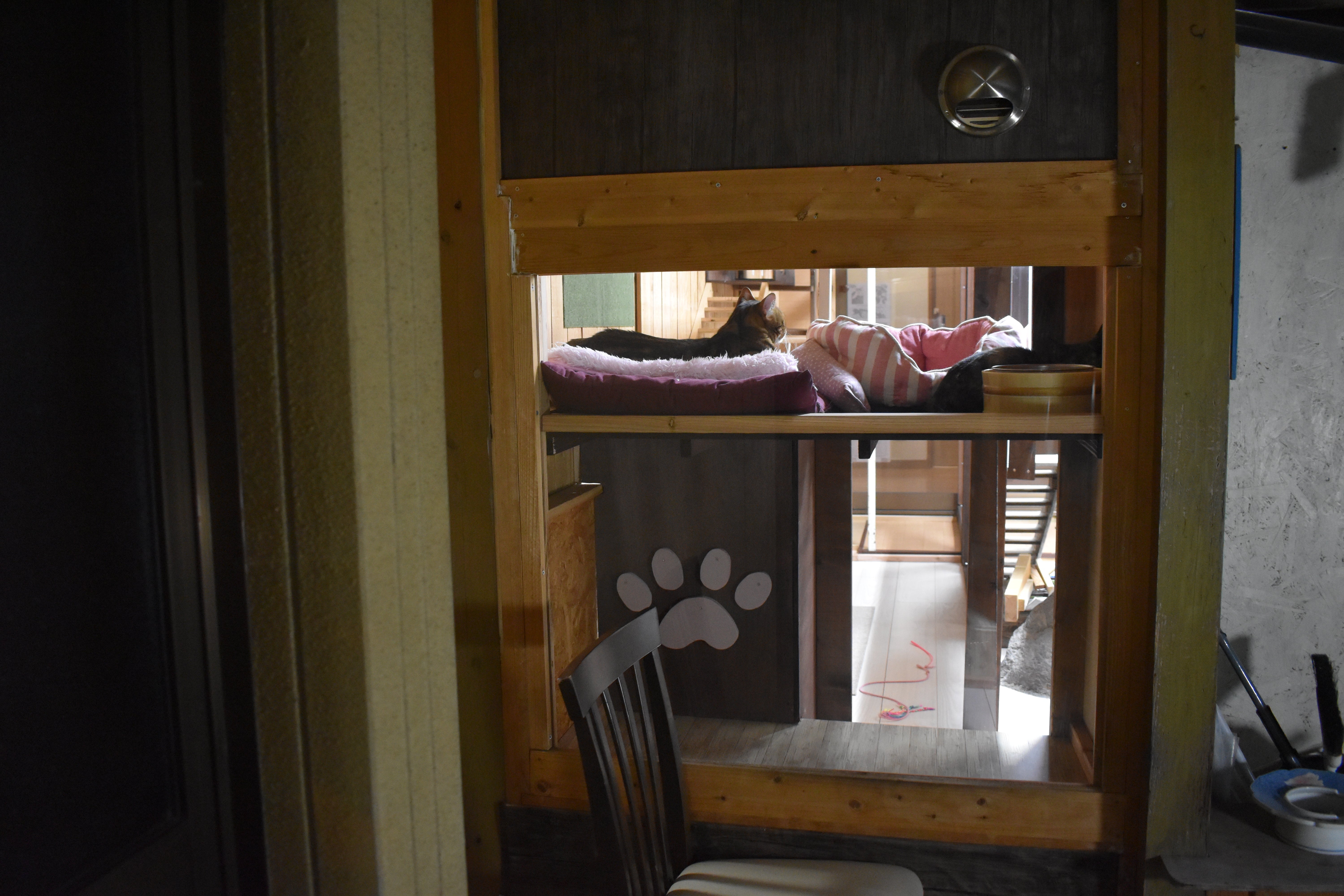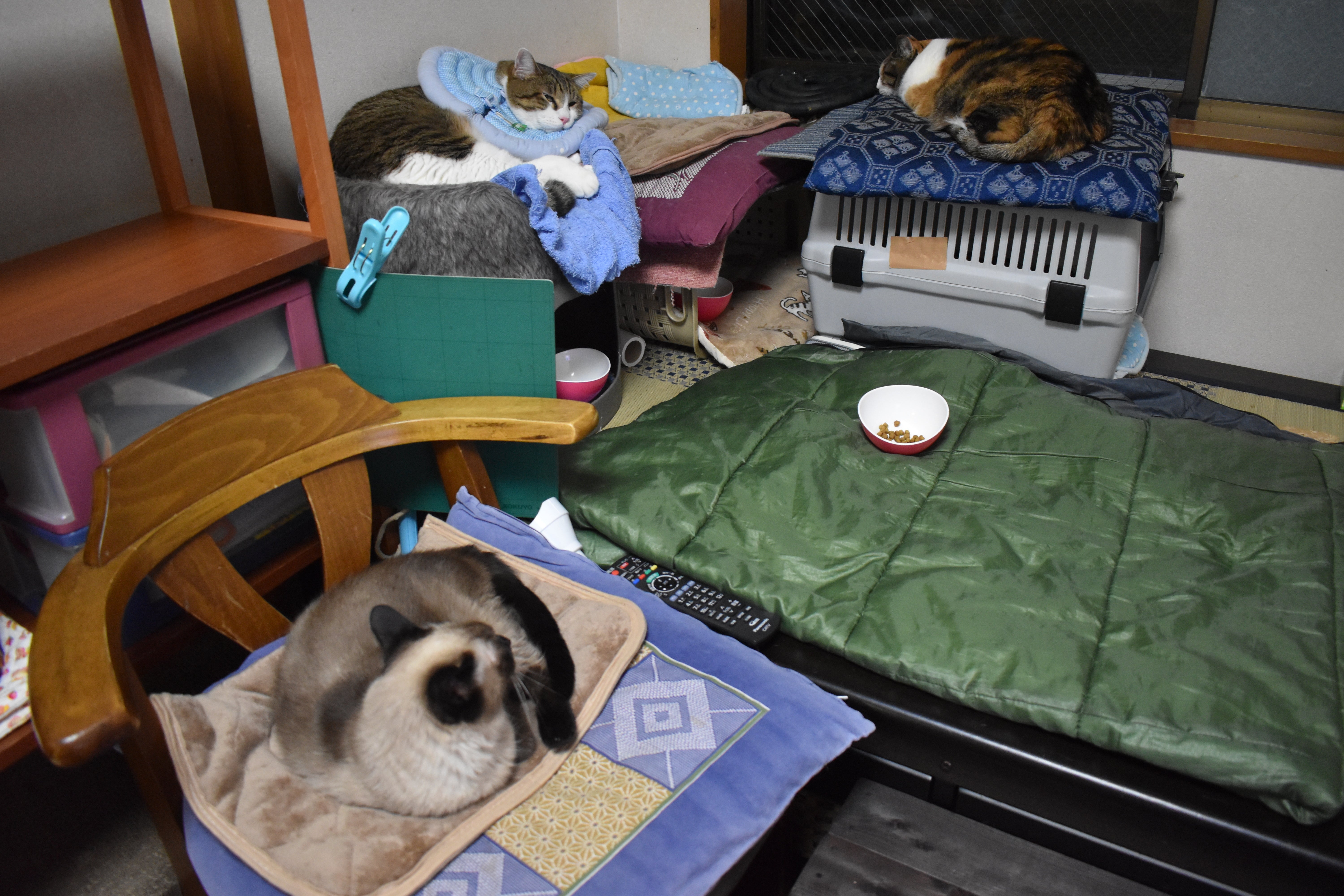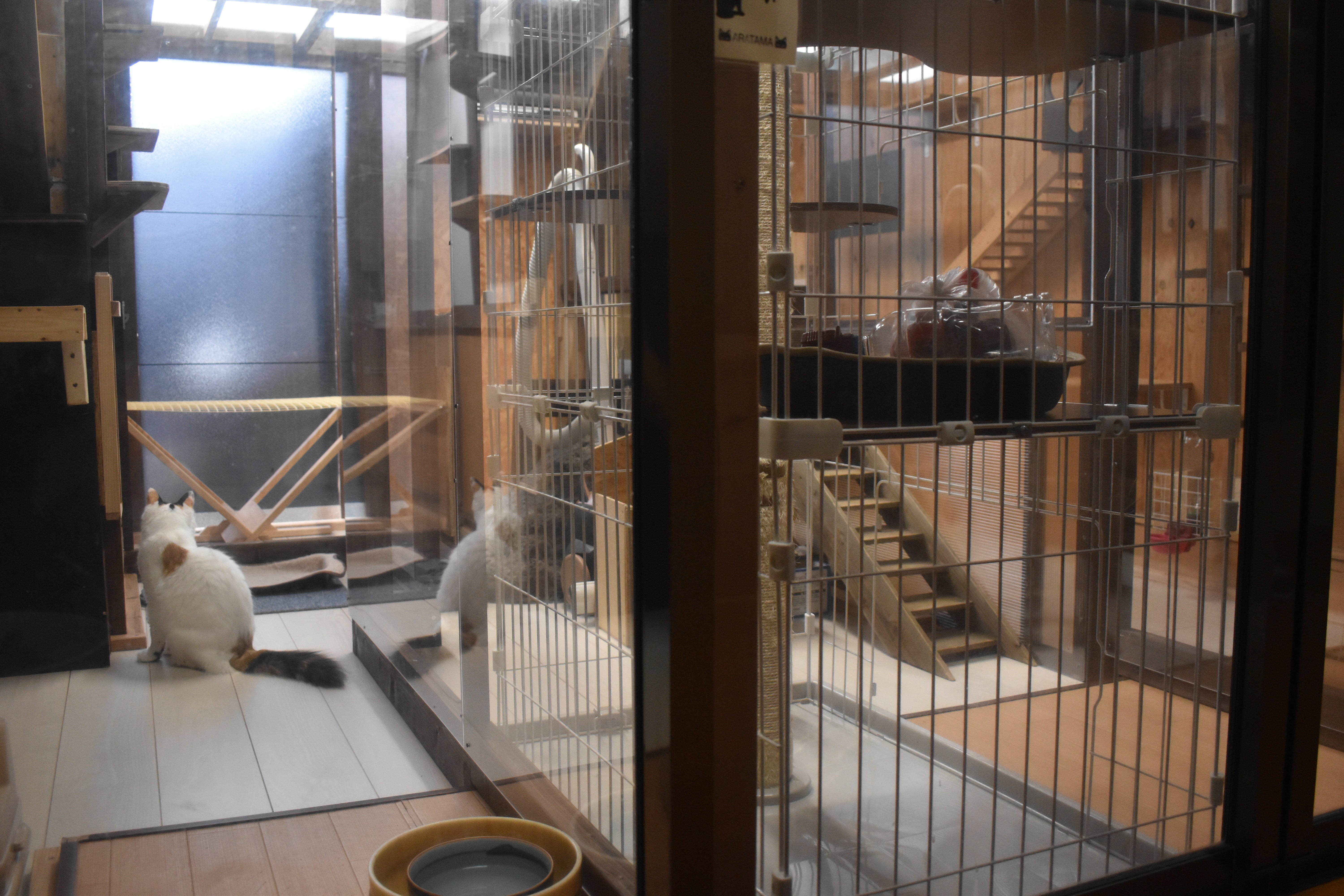 部屋を三つに分けて手前(左)が白血病のみこちゃん・きこちゃん姉妹の部屋で、真ん中が譲渡予定の子ねこ、オルガ・フォルテ・ドルチェ・琴ちゃんの一時部屋、そして一番奥(左)がテンカンとアレルギーのあるモーガン君・わさびちゃんの部屋とのことです。
