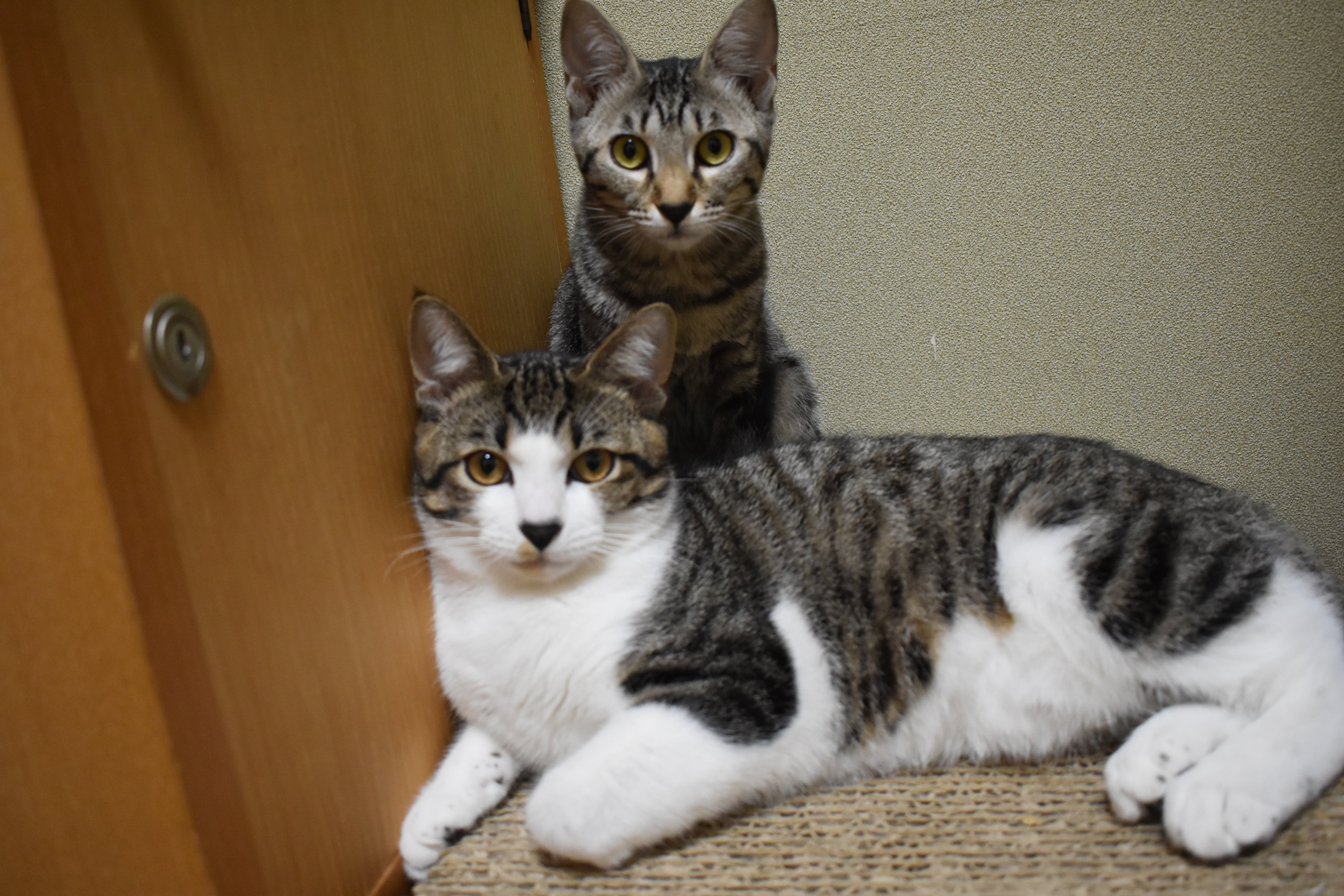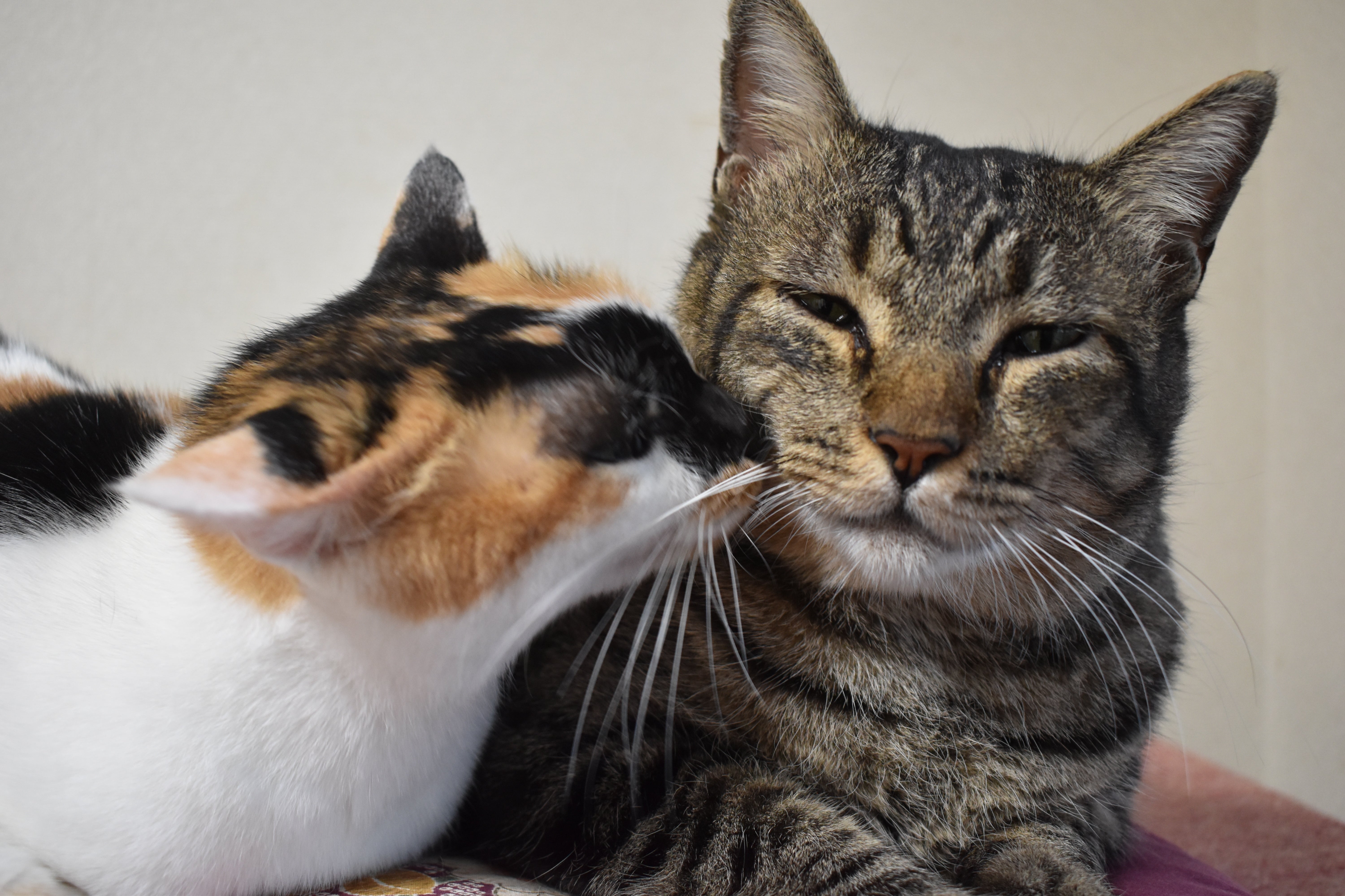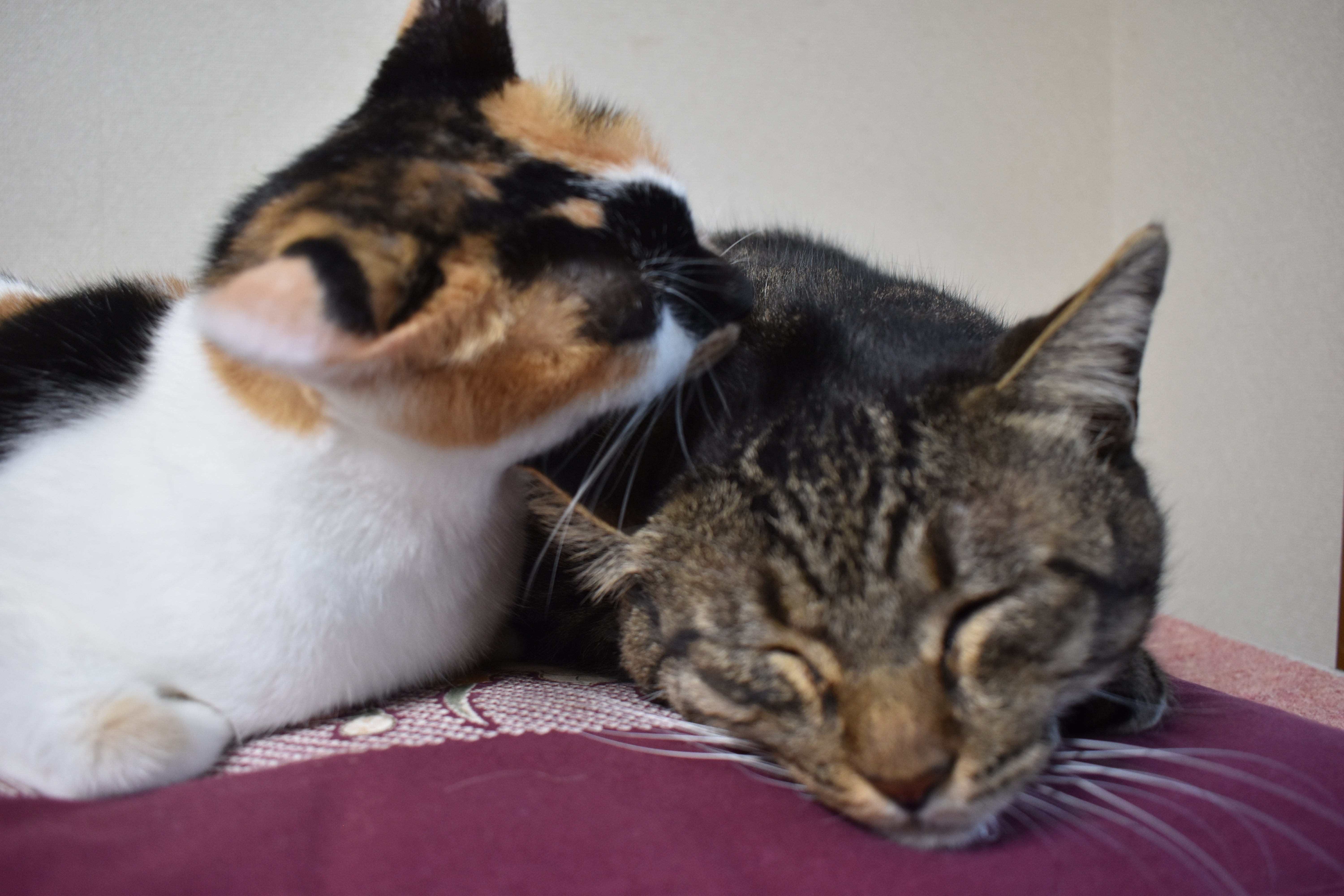左:三毛猫の三毛子 右:キジサバ猫のとら丸 本当に仲が良い二匹。幸せな気分になります。