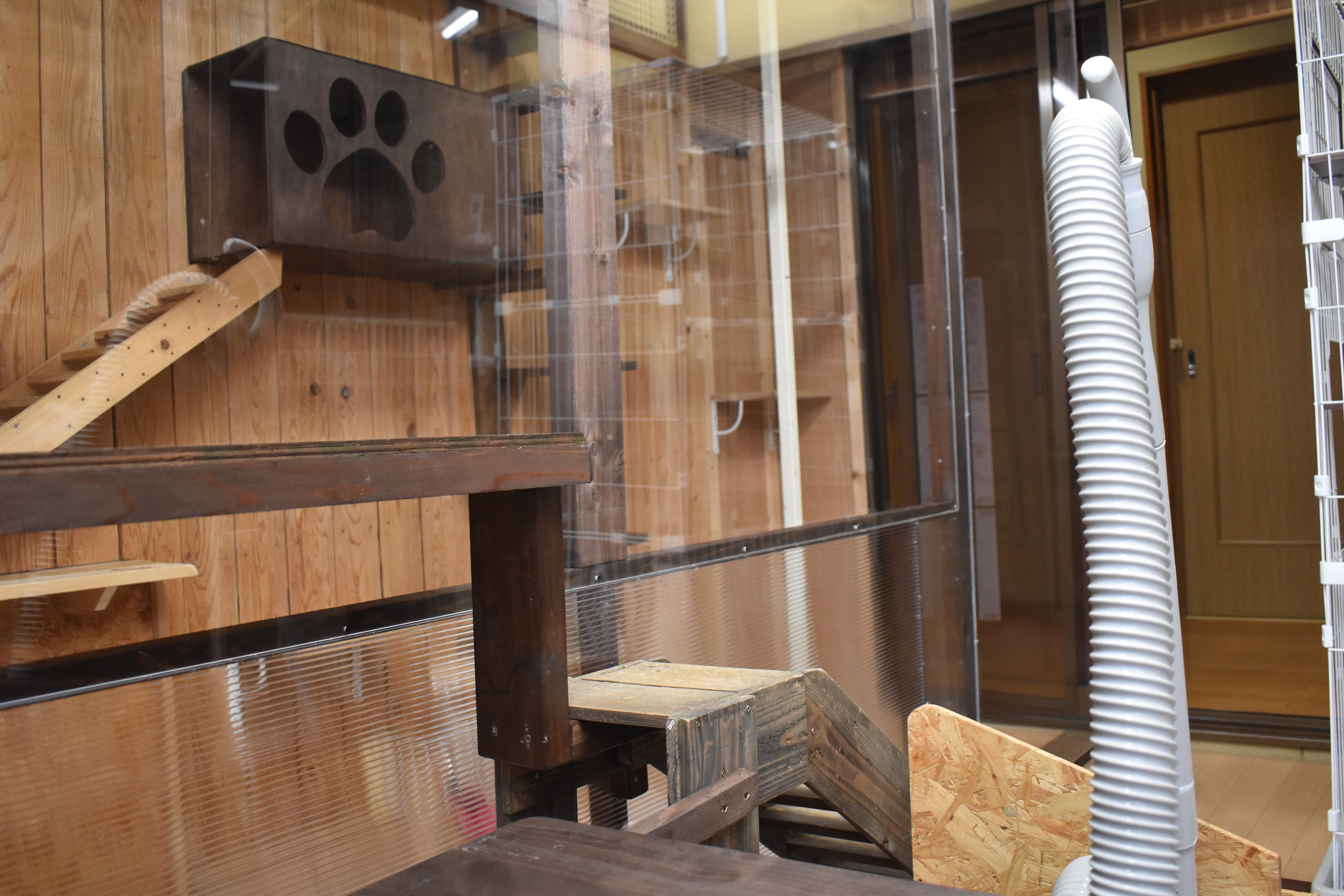 モーガン君とわさびちゃんのお部屋は温泉の出入口からガラス越しに見られるようにしています。左のドアはお風呂のドアです。
