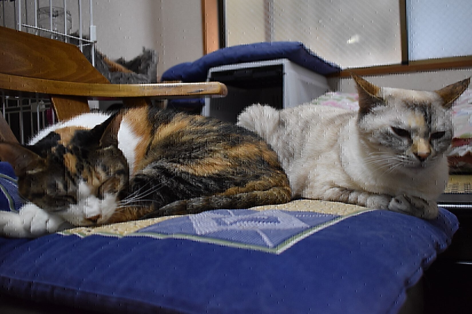 黒猫くう君 シャー言われました( ノД`)シクシク… 白猫オッドアイのたまこちゃんと寄り添って寝ておりました。くう君に仲良しがいたのですね。良かった。