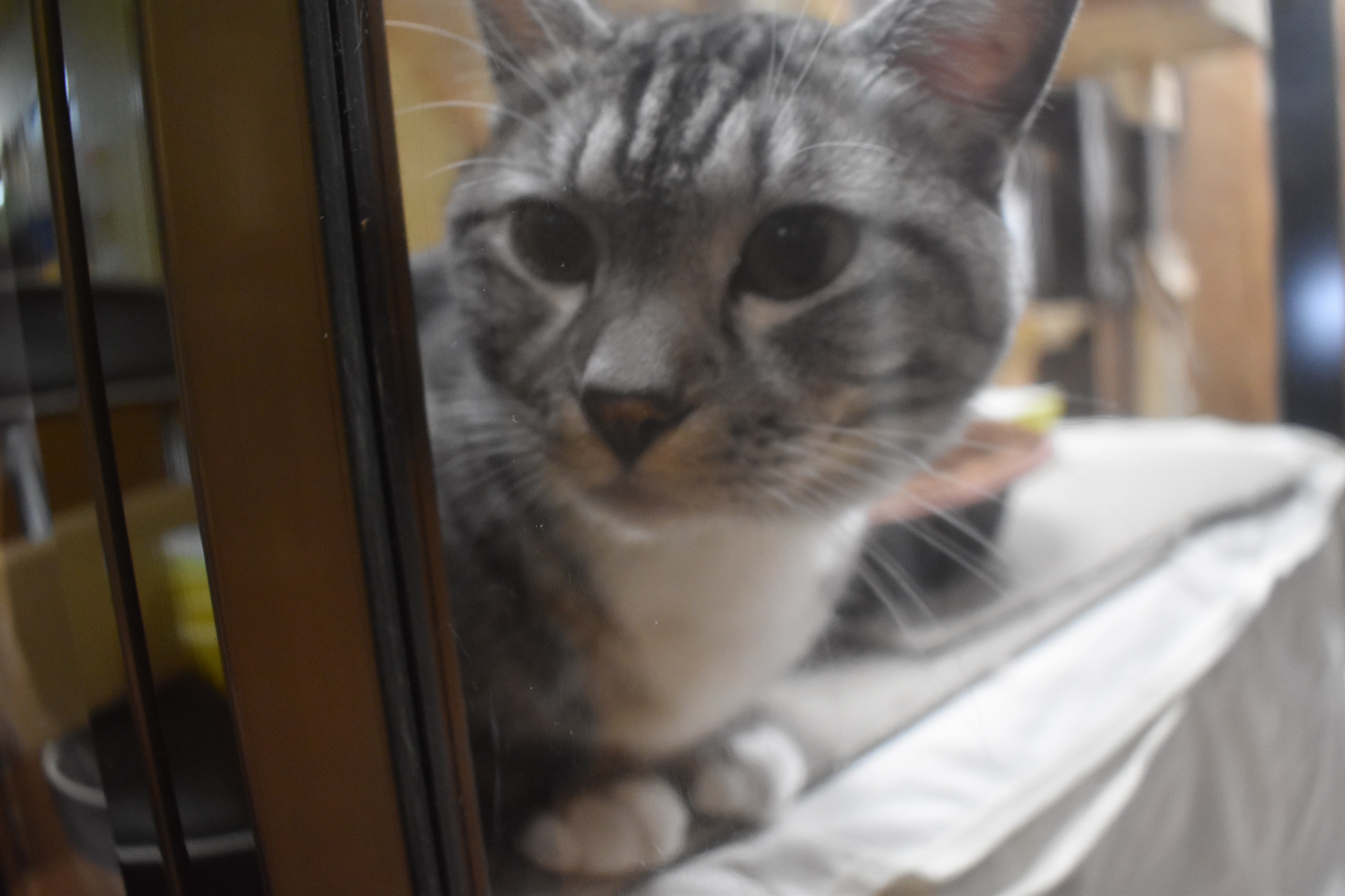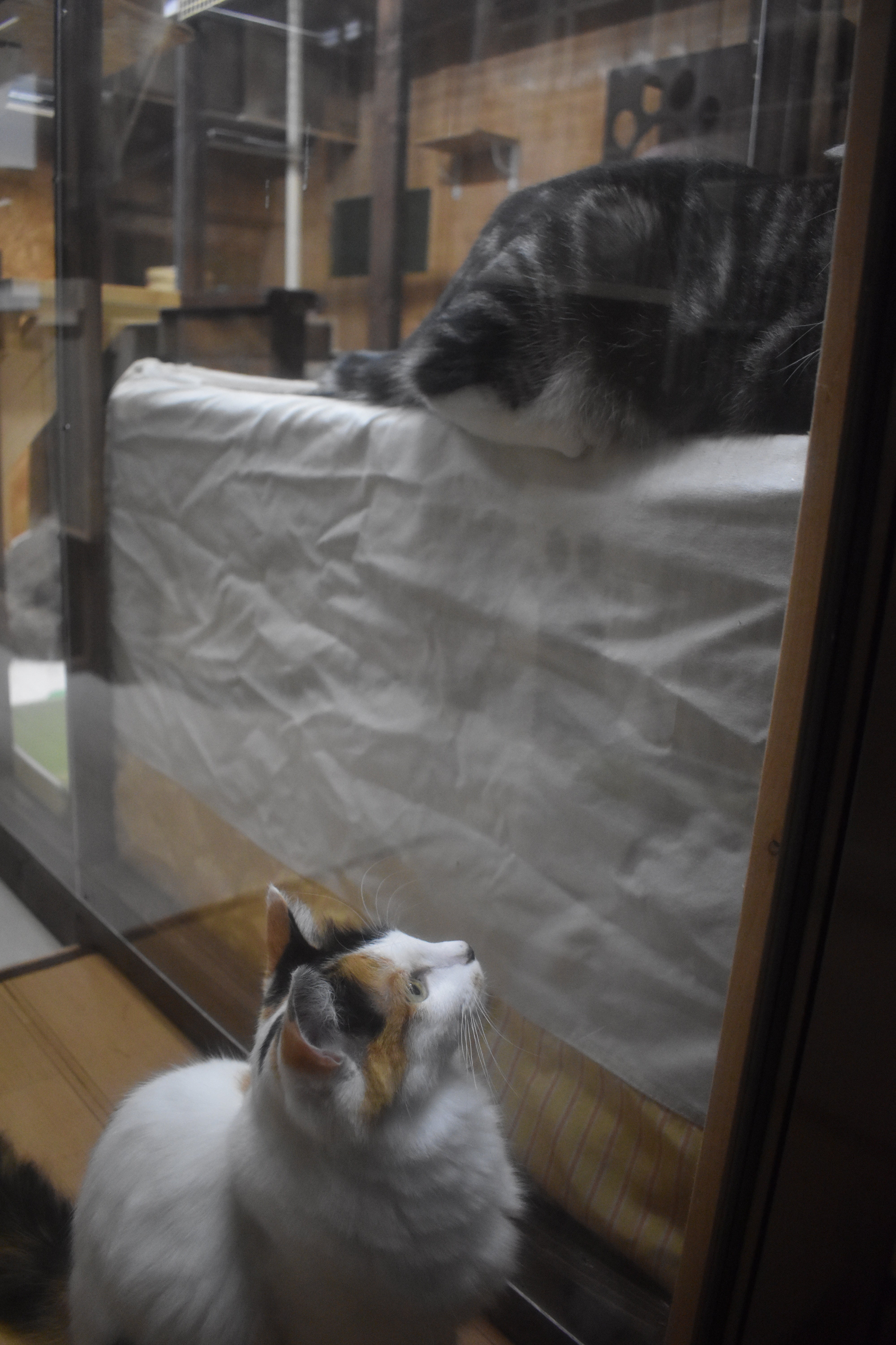 最後に寝ぼけ顔のダスティ君! 可愛いです。アクリル板越しの部屋にいて、ボスのモカ君から目の敵にされています。モカ君に気を遣っているのがわかります。