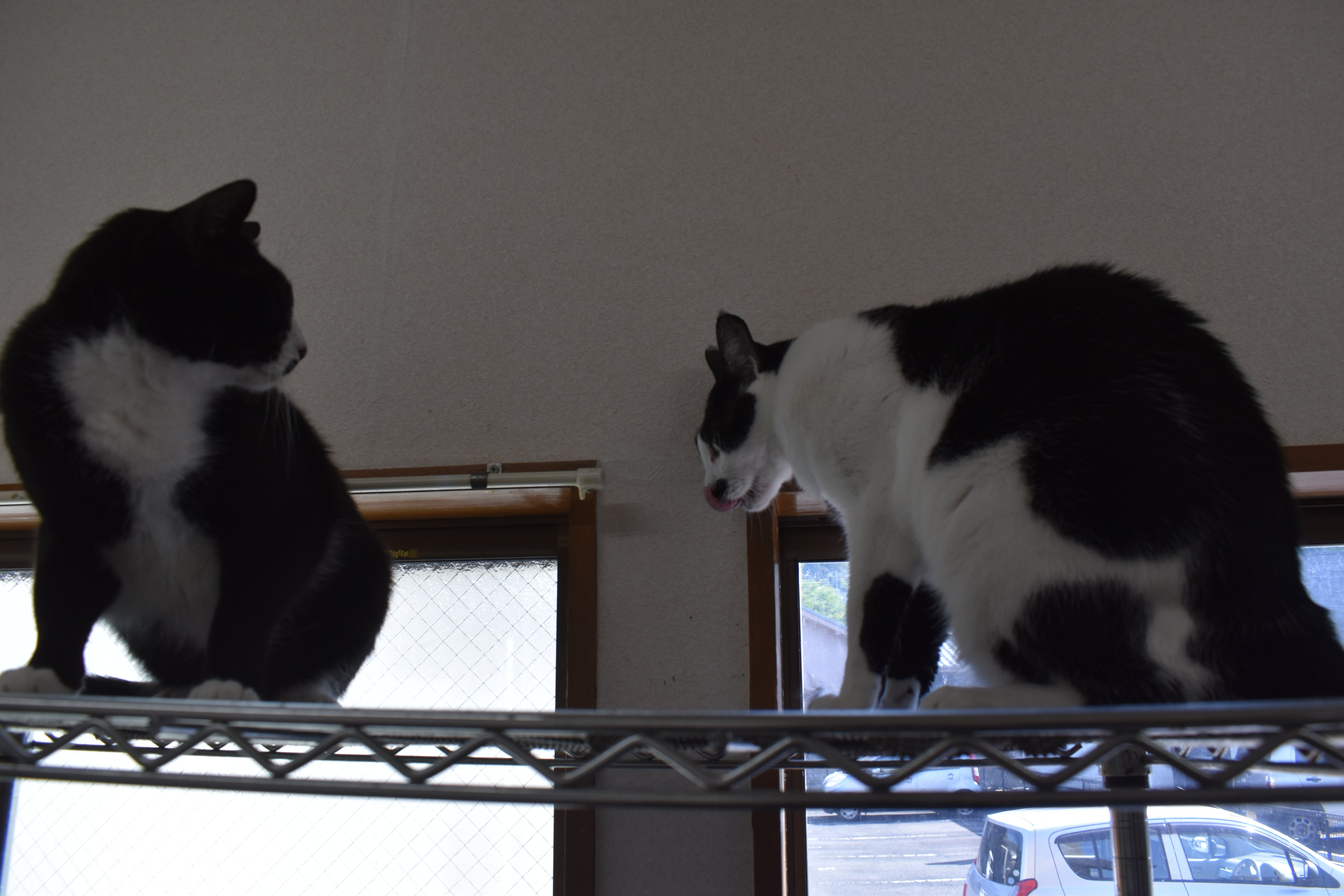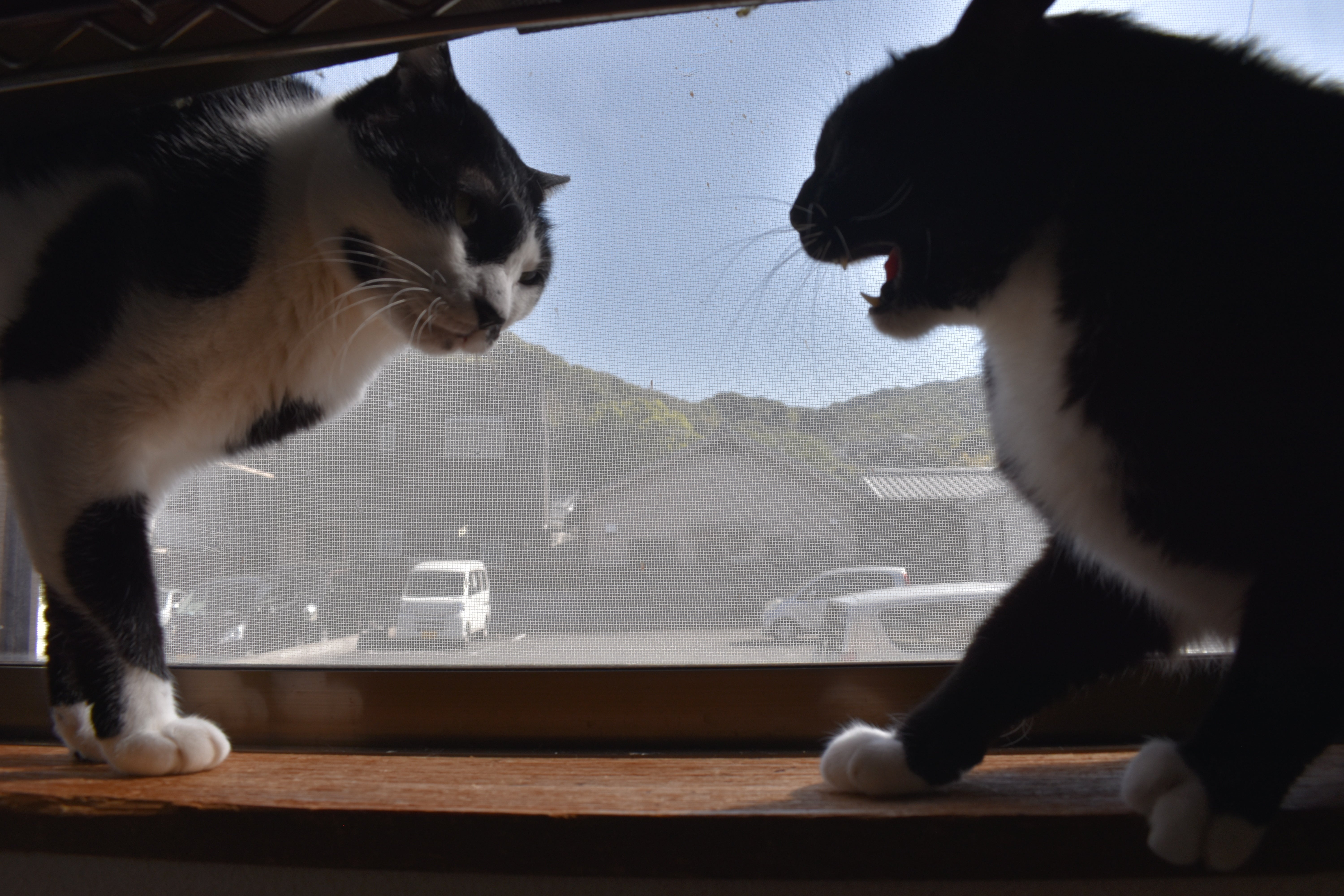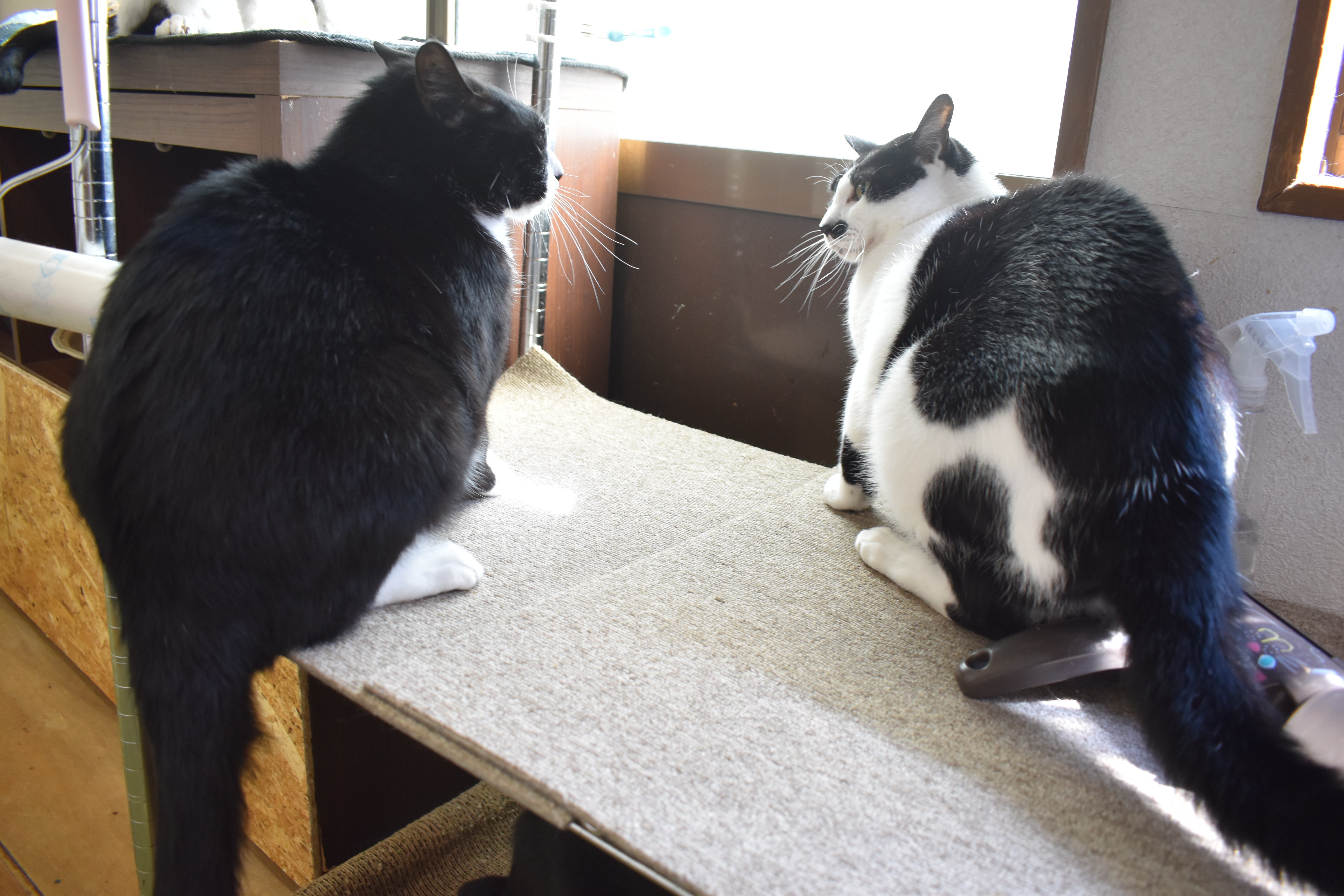左:マカ君? 右:ユズ君 ユズ君が強いみたいで威嚇しています。