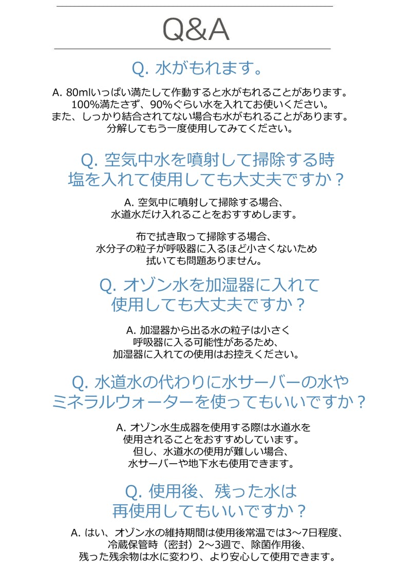 · より濃度の強いオゾン水をお求めの方は同封されている専用スプーンで塩(添加物の入ってない一般の塩)を少し入れてご使用ください。
