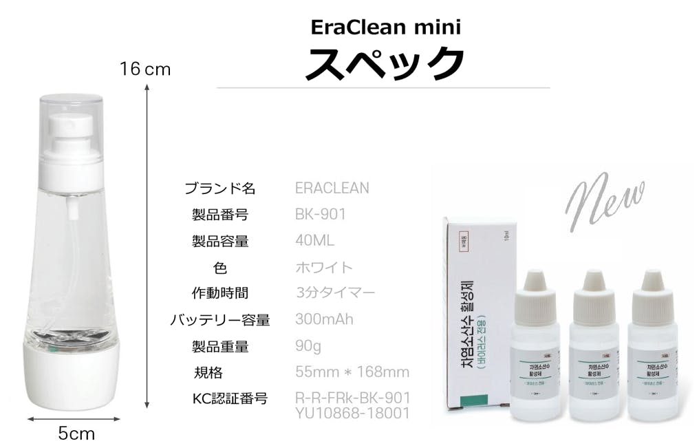 EraCleanは超小型電極開発と「電気分解法」を活用した携帯用ウィルス除菌剤を作るための努力の末、日常生活で携帯性の優れたオゾン水発生器を作り、新型コロナウィルス発生後5カ月の研究の末、EraCleanのオゾン水とウィルス死滅活性剤を利用することで特定の環境下(※)で新型コロナウィルス99.99%不活化できることが確認されました。