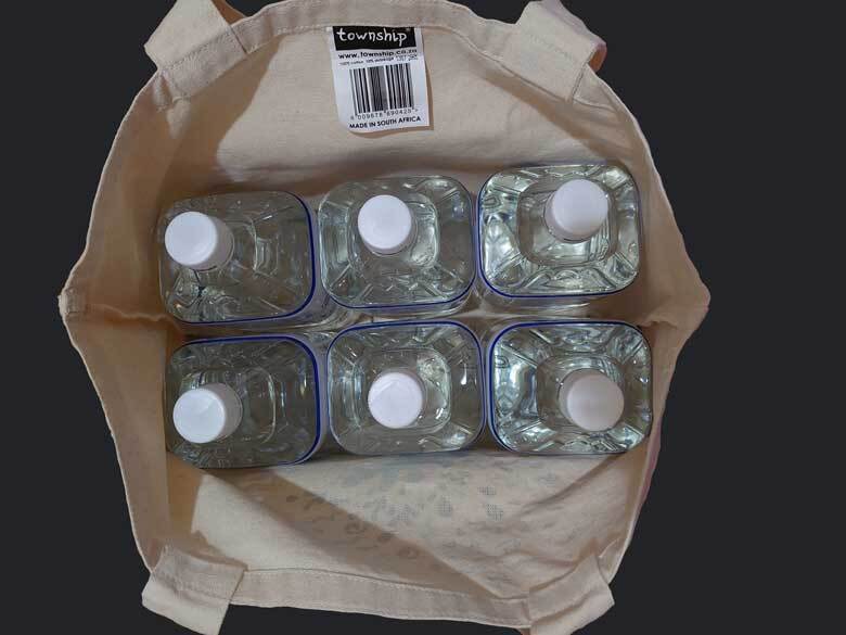 2リットルペットボトル6本がすっぽり入ります。持ち上げても平気。補強材などは入っていない為シッカリ感はないですが、直ぐに破れそうな危なさはありません。タグには『MADE IN SOUTH AFRICA』と、当然ですが記載されています。