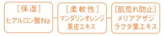 肌の為に、ヒアルロン酸Na(保湿効果)、マンダリンオレンジ果実エキス(柔軟性効果)、メリアアザジラクタ葉エキス(肌荒れ防止効果)を使用し、肌のバリア機能をサポートしています。