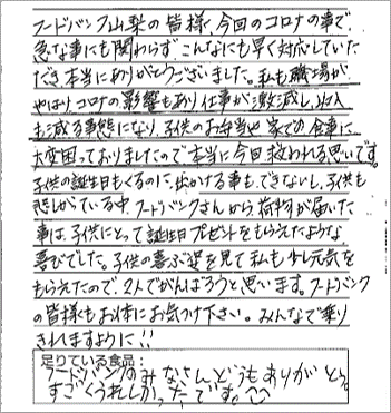 ●食料品をたくさん買うことができなくて、おやつもたまにでしたが、食料支援を受けて子どもが嬉しくて喜んでいます。