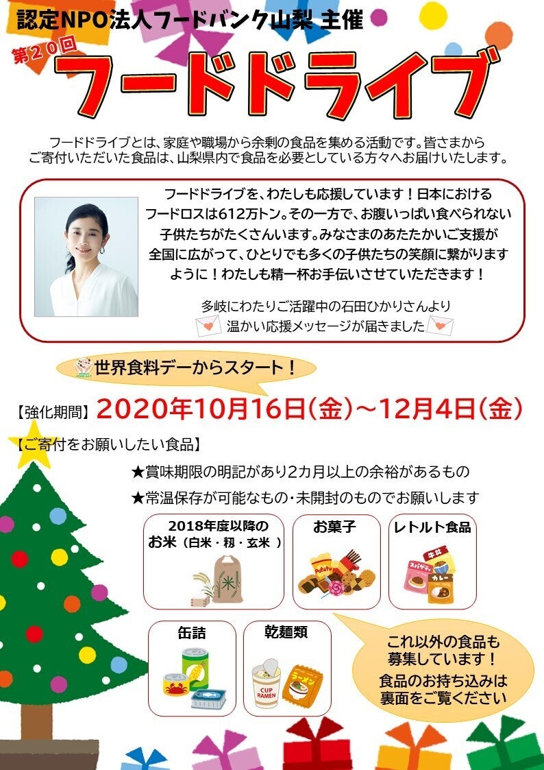今回のフードドライブも女優の石田ひかりさんが応援して下さることになりました。