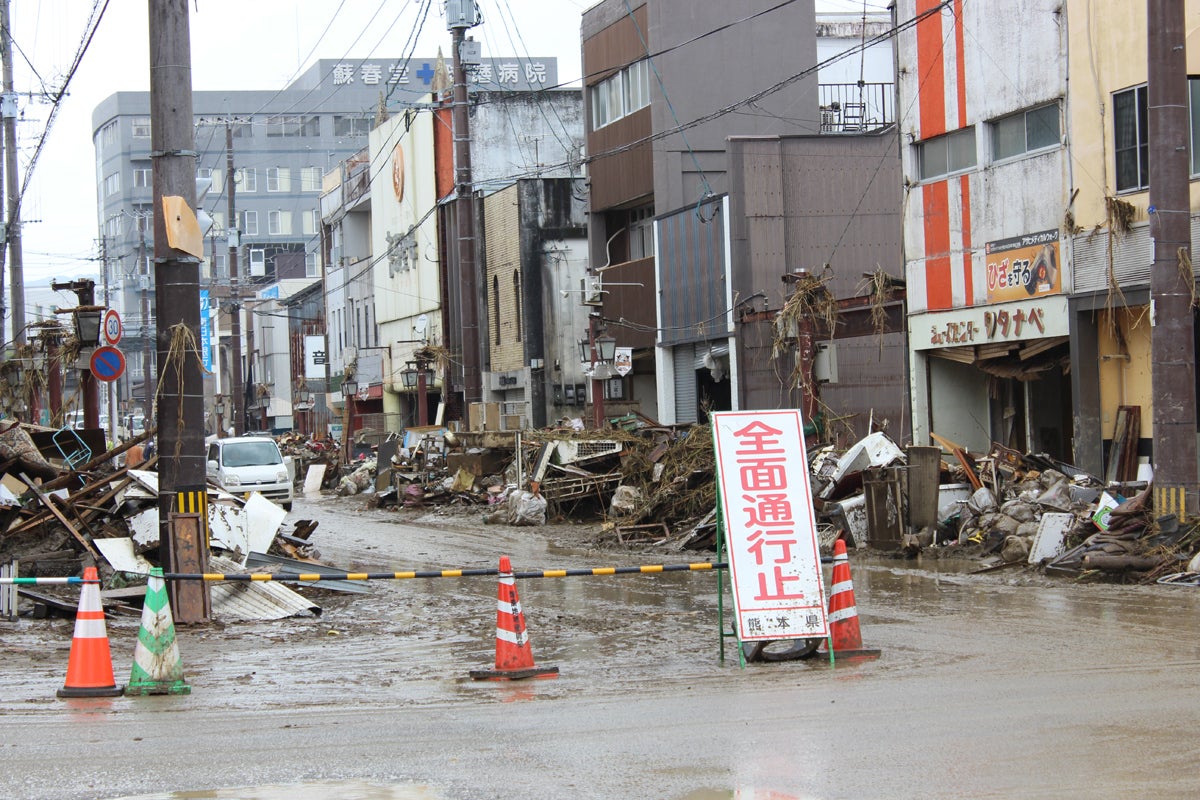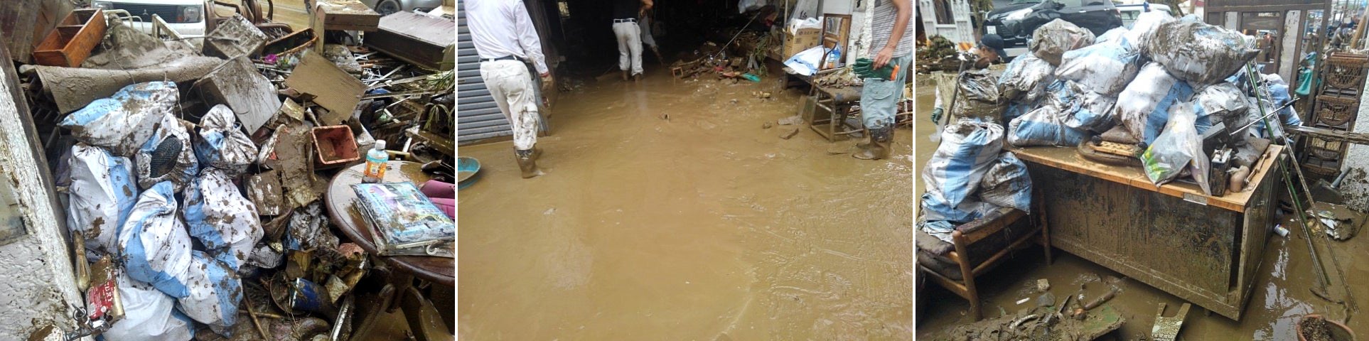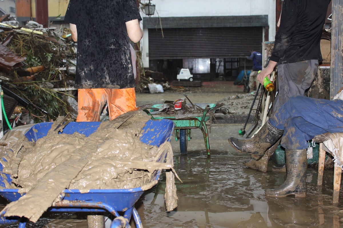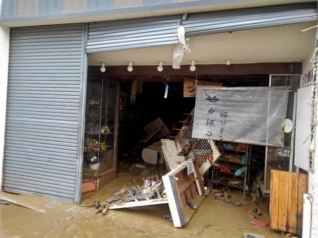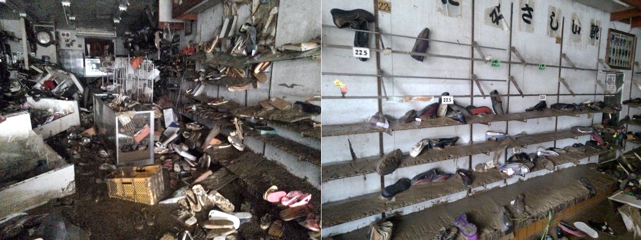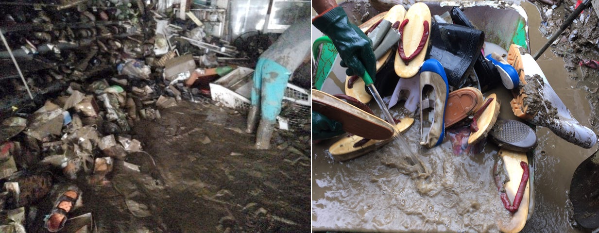 2020年7月4日、九州の豪雨による洪水で、熊本県人吉市九日町の創業97年の老舗『つぼや履物店』が二階まで浸水し、壊滅的な状況となりました。
