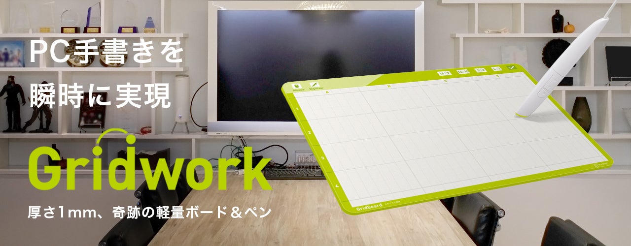 吉田は音声ペンの成功に胡坐をかくことなく、よりドットコード技術の発展形を見出すべく研究開発を重ねて来ました。吉田の発想は「0から1を創ることを経営理念に掲げ、独創的な技術開発で利便性の高い製品を実現する。」ことに重きを置いており、「専用のアプリをインストールすることなくUSBを挿すだけで、ホワイトボードや共有画面に表示された資料、教材に相互に自由に書き込むことが出来る。」という手書きツールGridworkが生まれました。