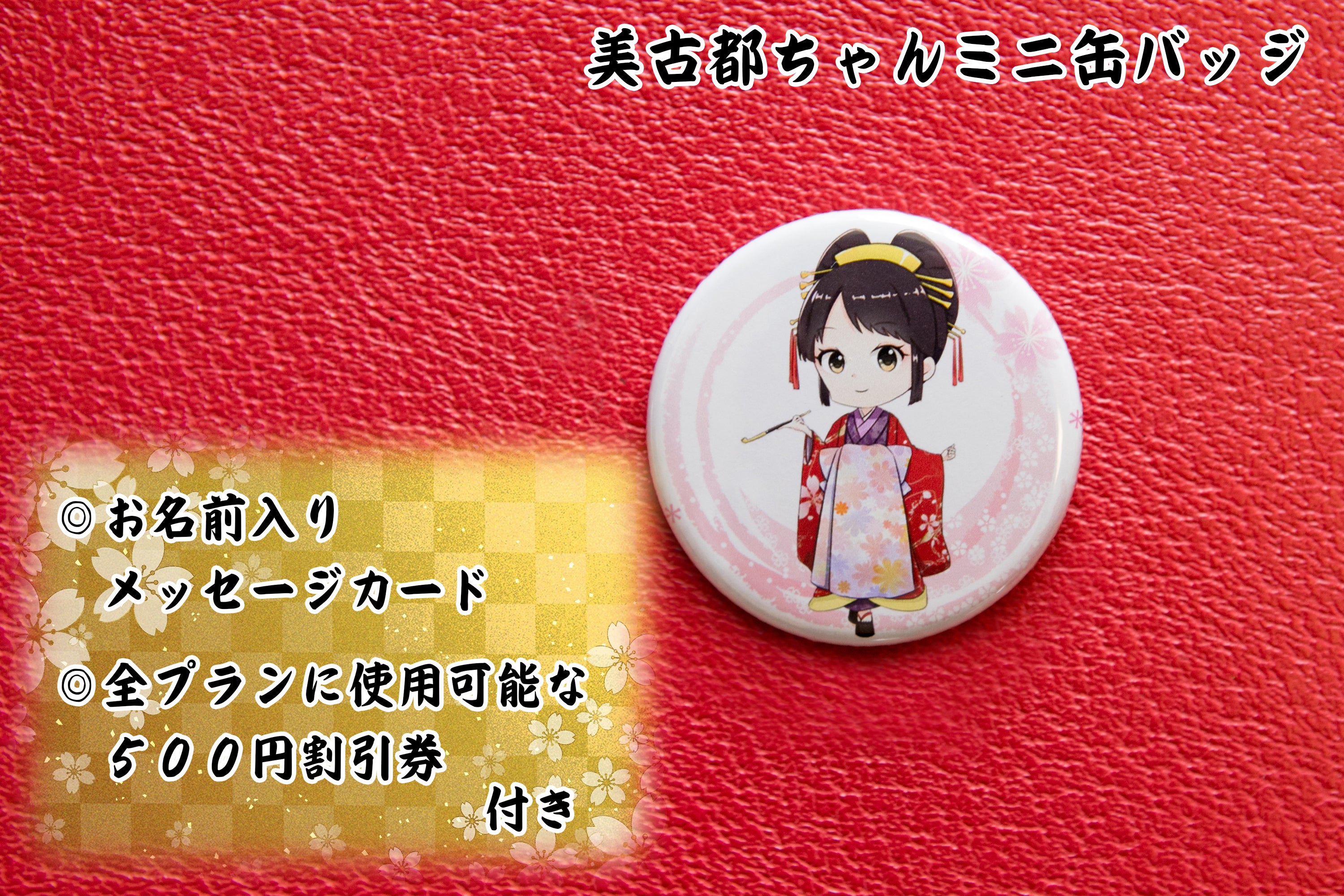 当店マスコットキャラクター『美古都ちゃん』の缶バッジ、お客様のお名前入りメッセージカード、全プランにご使用いただける500円割引券の3点セットにお礼の手紙を添えてお送り致します。