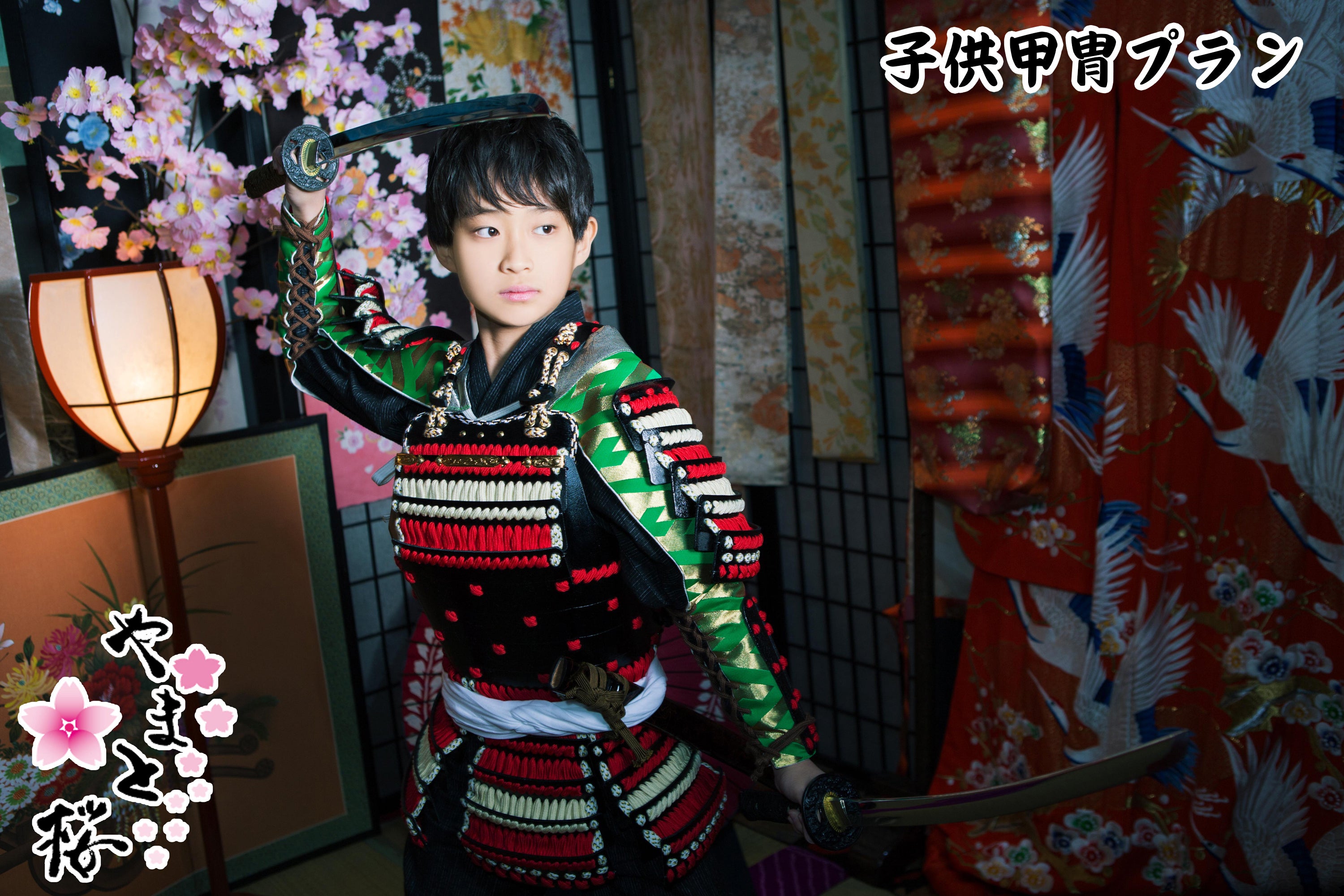 当店で使用している着用型甲冑は非常に軽い素材で作られた特注品ですので、お子様でも安全に着用していただけます。