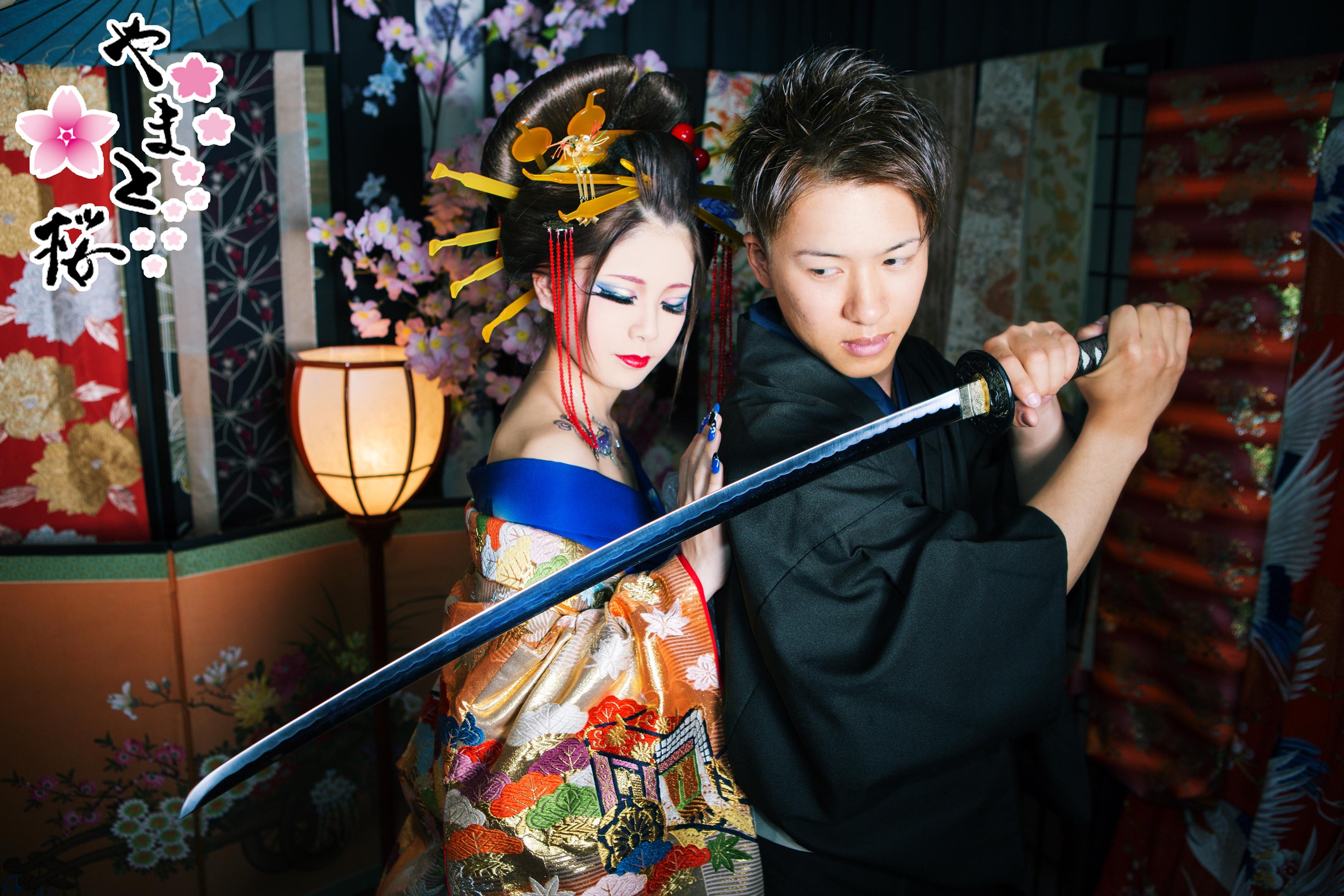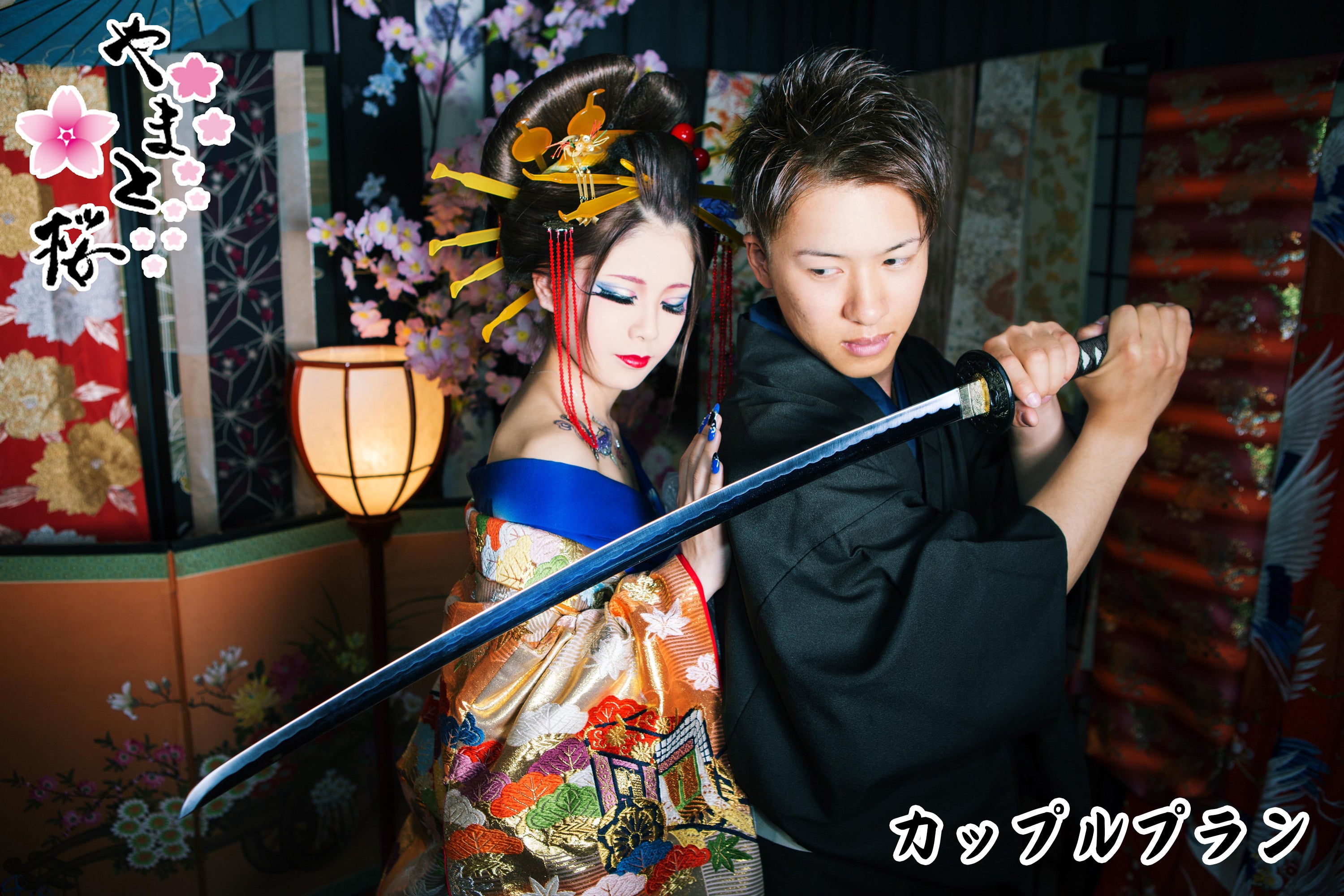 女性は花魁スタイル、男性は和服姿でカップルでの撮影をお楽しみいただけます。